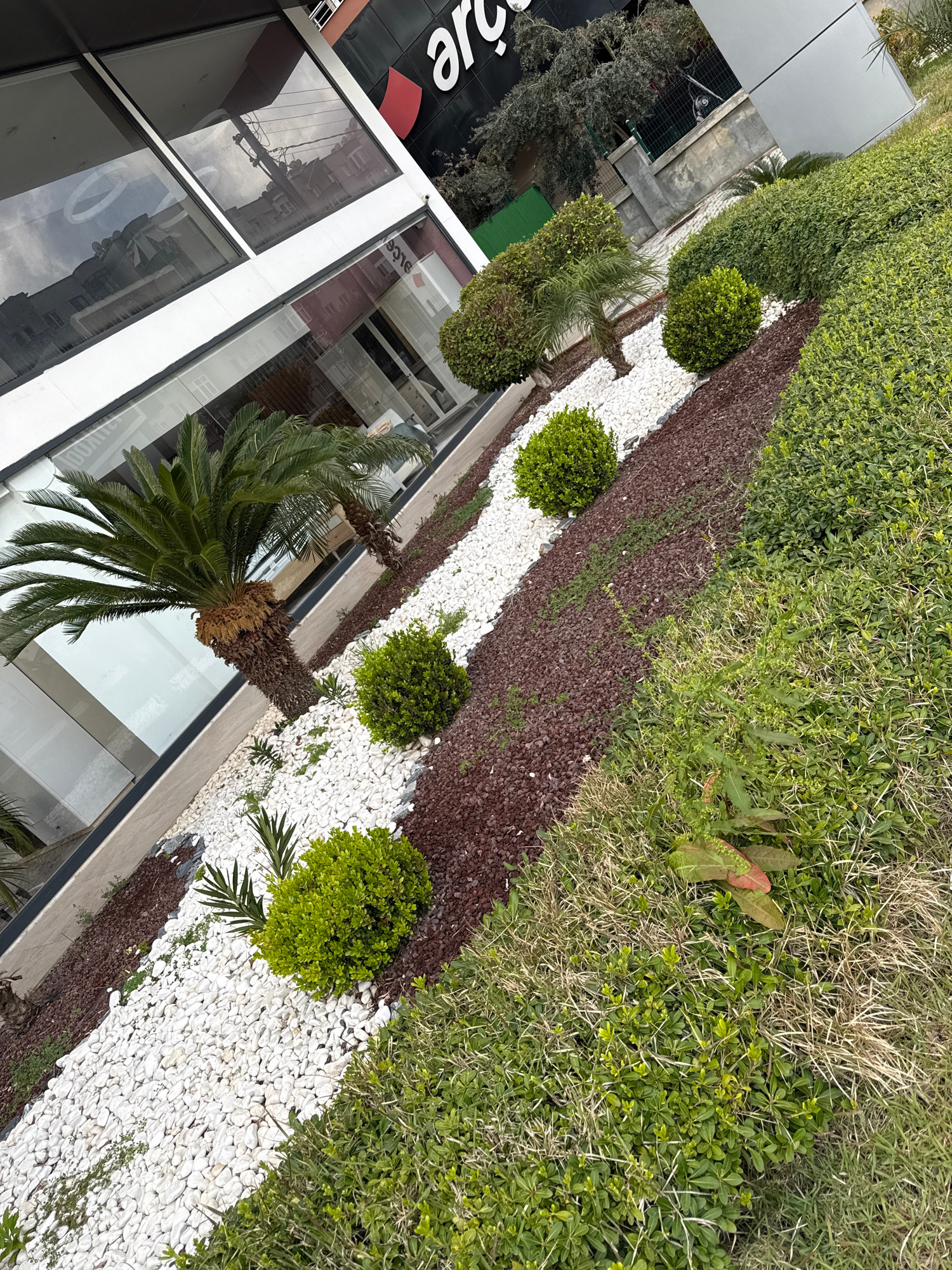The image shows a landscaped area adjacent to a building in Alanya, Turkey. The landscaping features a row of rounded bushes, a palm tree, a strip of white pebbles, and a strip of red-brown mulch. Theβ¦read more