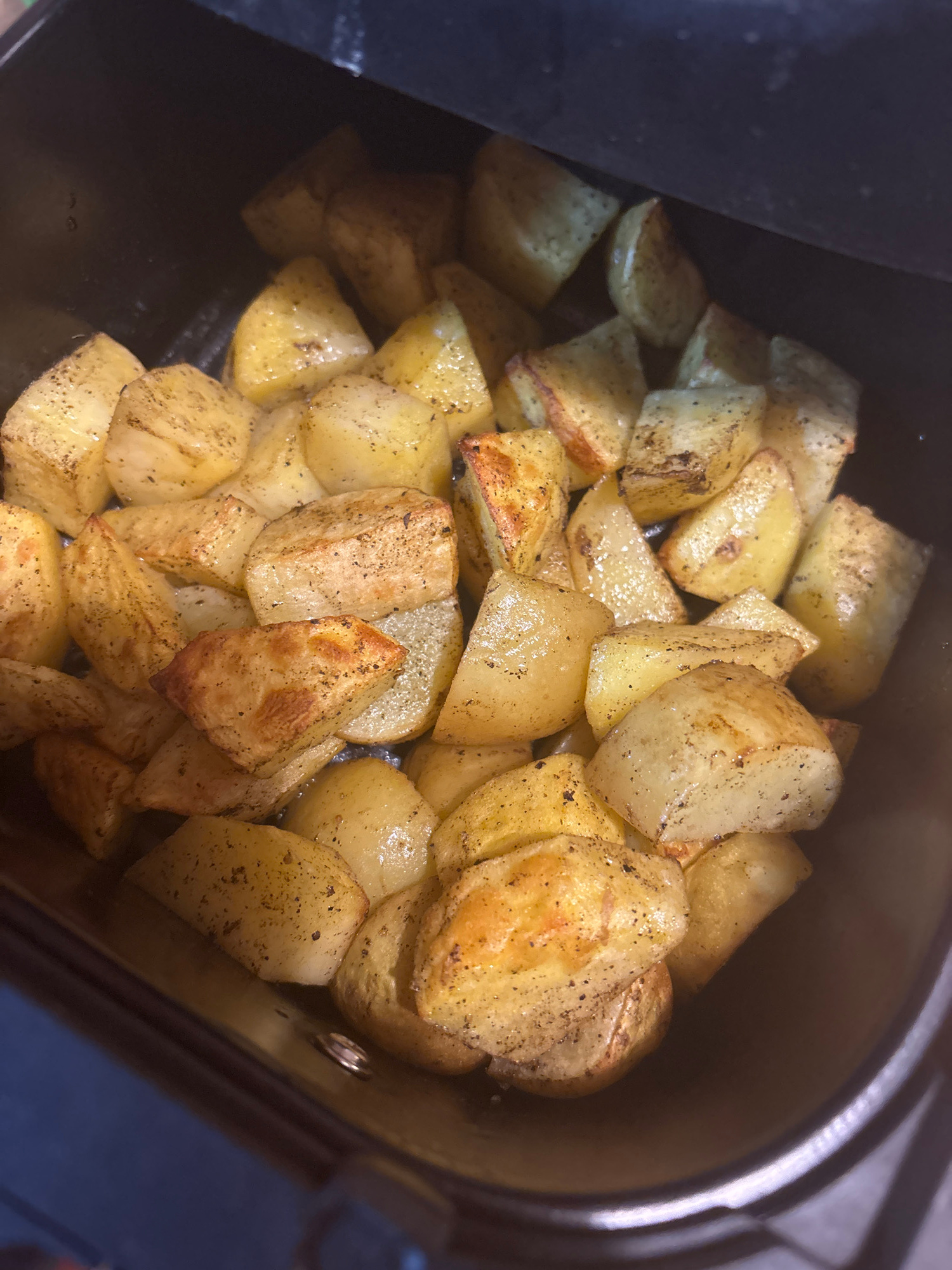 The image shows a close-up of golden-brown, cooked potato chunks inside a dark-colored appliance, likely an air fryer. The potatoes appear to be seasoned with black pepper and possibly other spices. T…read more
