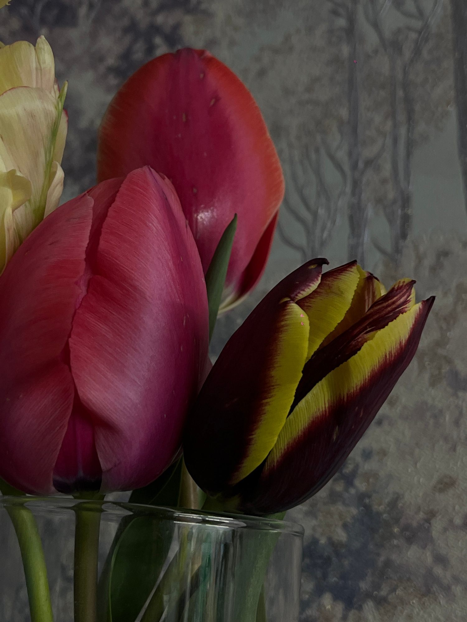 A close-up shot displays three tulips of differing colors in a clear glass vase. The top tulip is a blend of dark burgundy and yellow. Below, one tulip is predominantly red. The third tulip, situated…read more