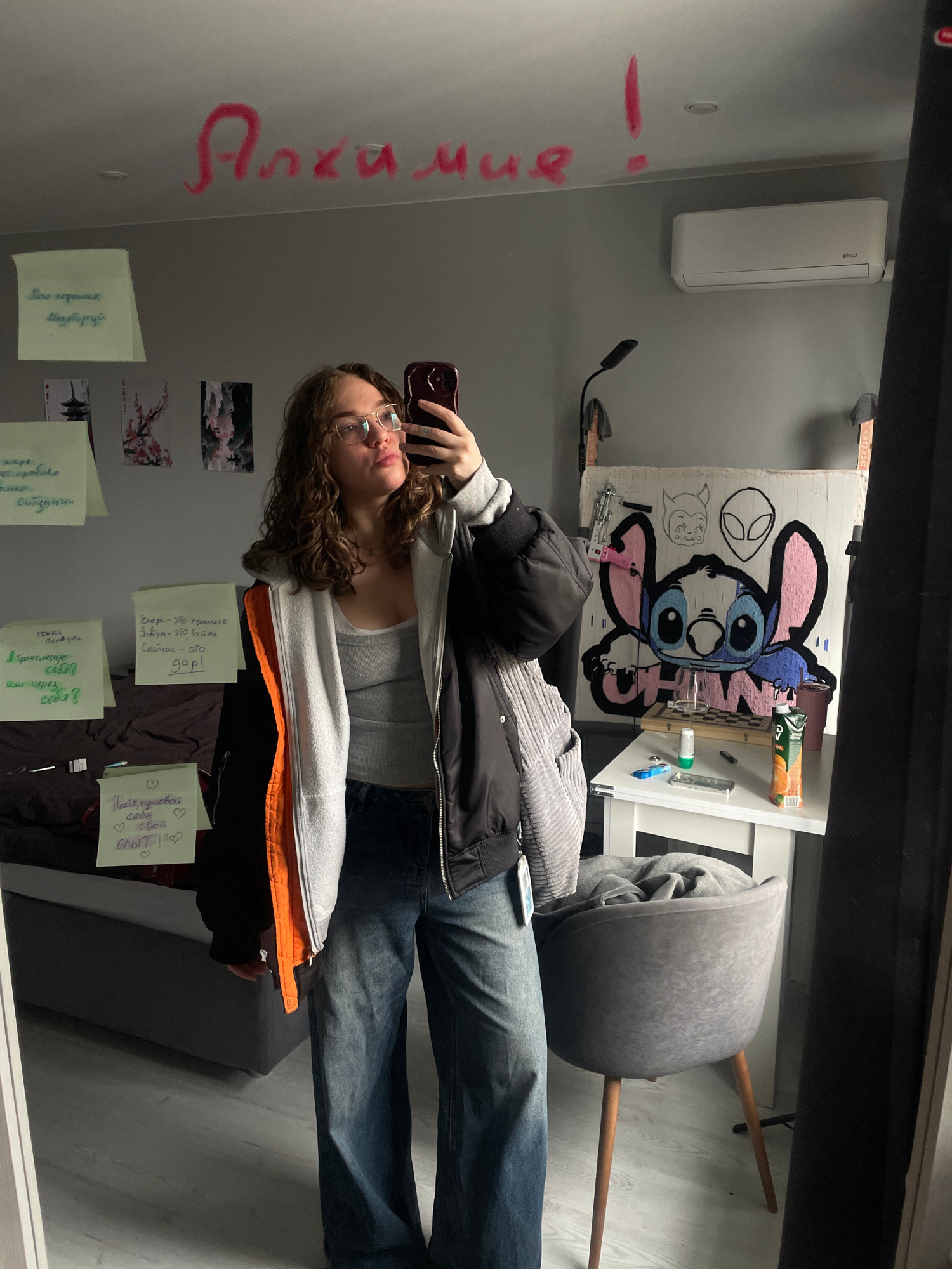 A woman takes a selfie in a mirror. Reflected in the mirror is a room. On the wall are several sticky notes with handwritten text in Russian. There are also two framed pictures. An air conditioning un…read more