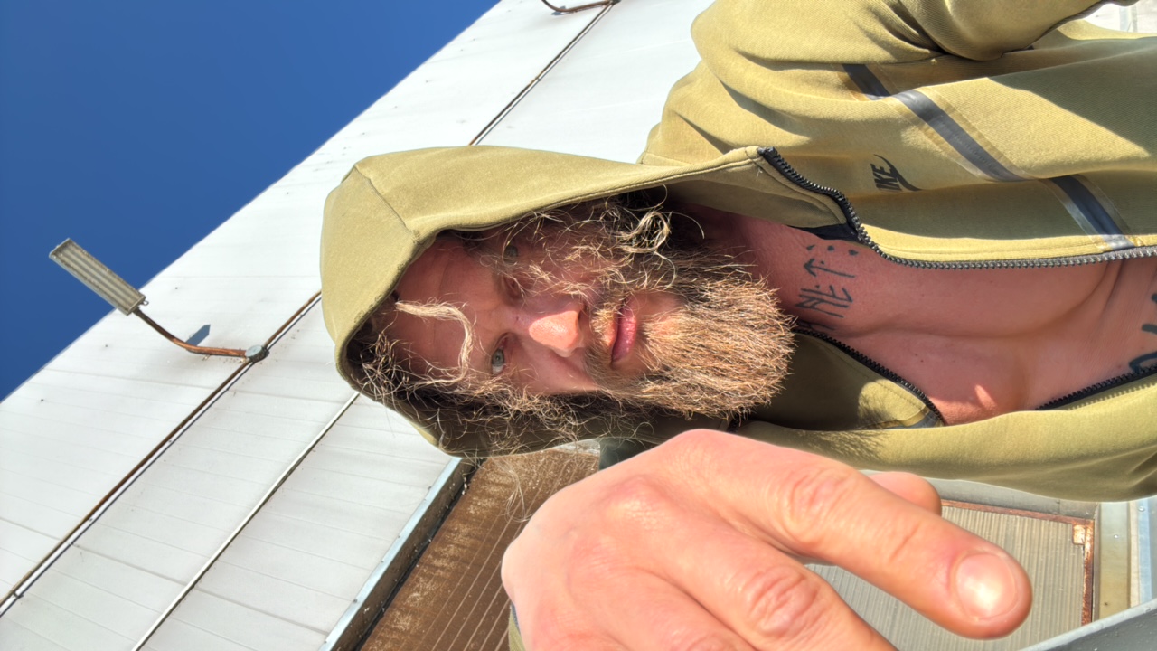 This media file captures a low-angle, upward-looking view of a man within an industrial or warehouse setting in Volzhsky, Russia. The primary subject is a man with light brown, curly hair and a promin…read more