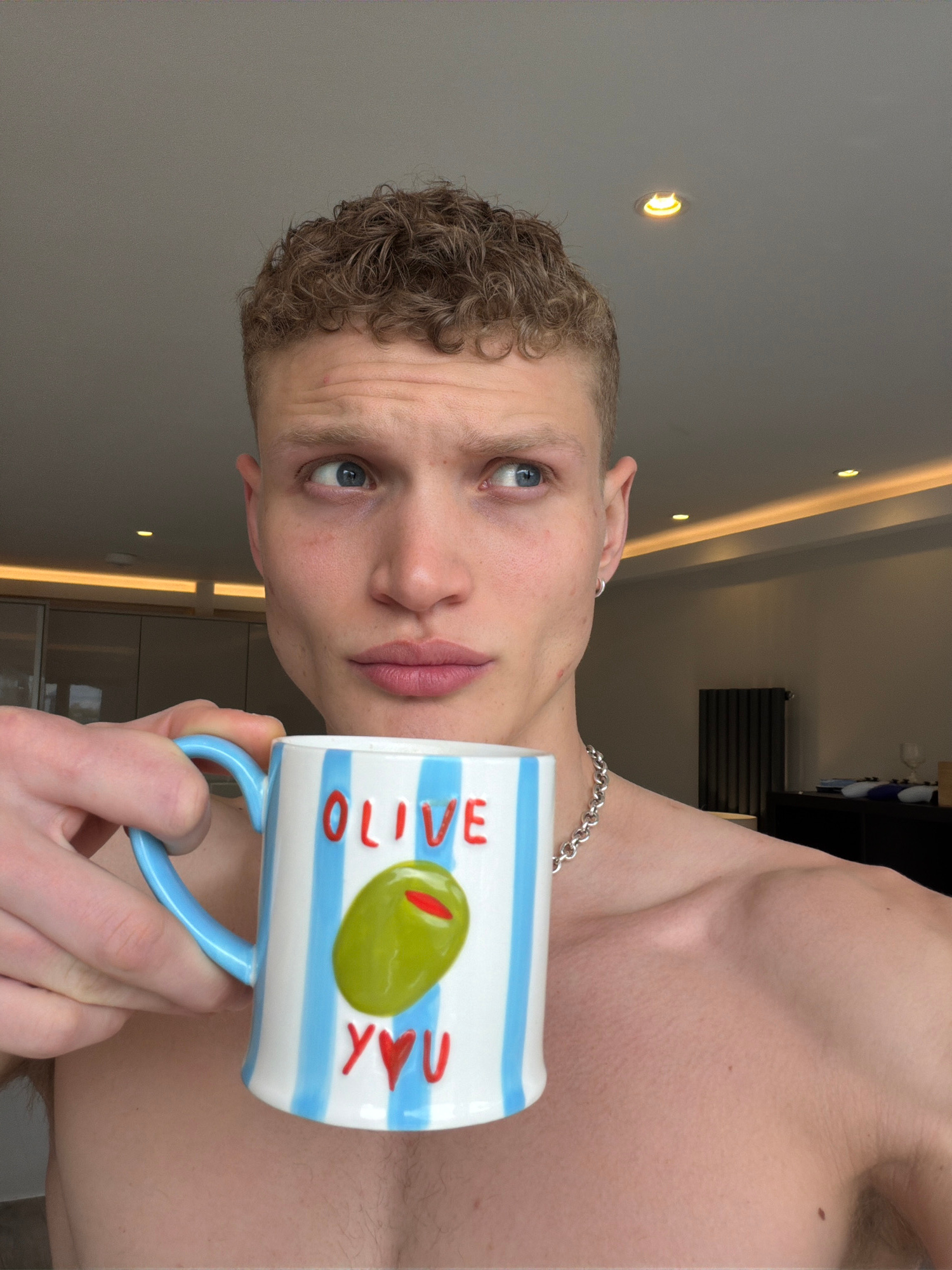 A close-up, indoor portrait shows a fair-skinned person with short, light brown curly hair and blue eyes holding a mug. The mug is white with blue horizontal stripes and features the words "OLIVE" and…read more