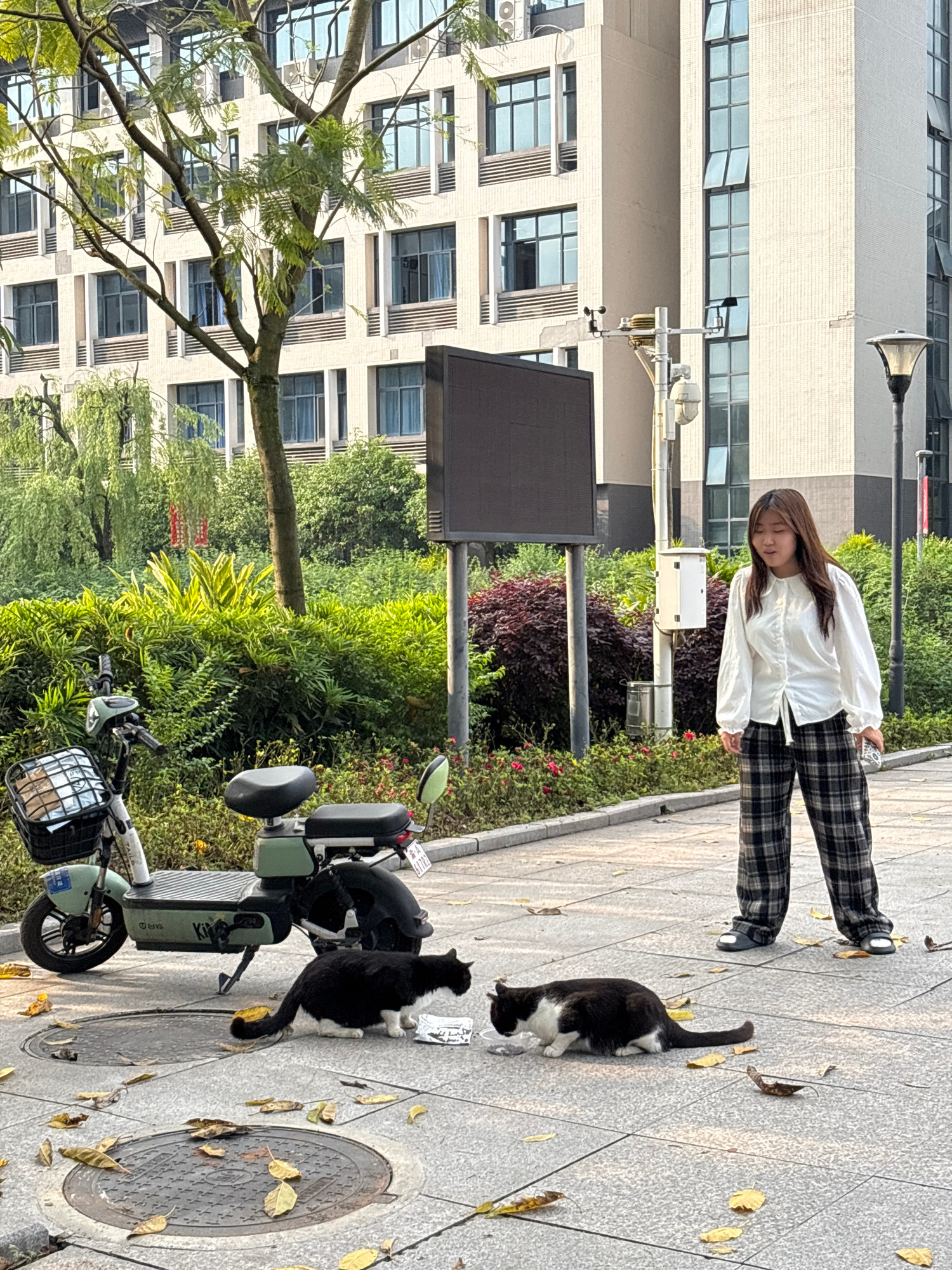 A young woman in a white top and plaid pants stands on a paved sidewalk in Jiangjin, China. Two black and white cats are nearby; one is on the sidewalk, and the other is near a parked light-green elec…read more