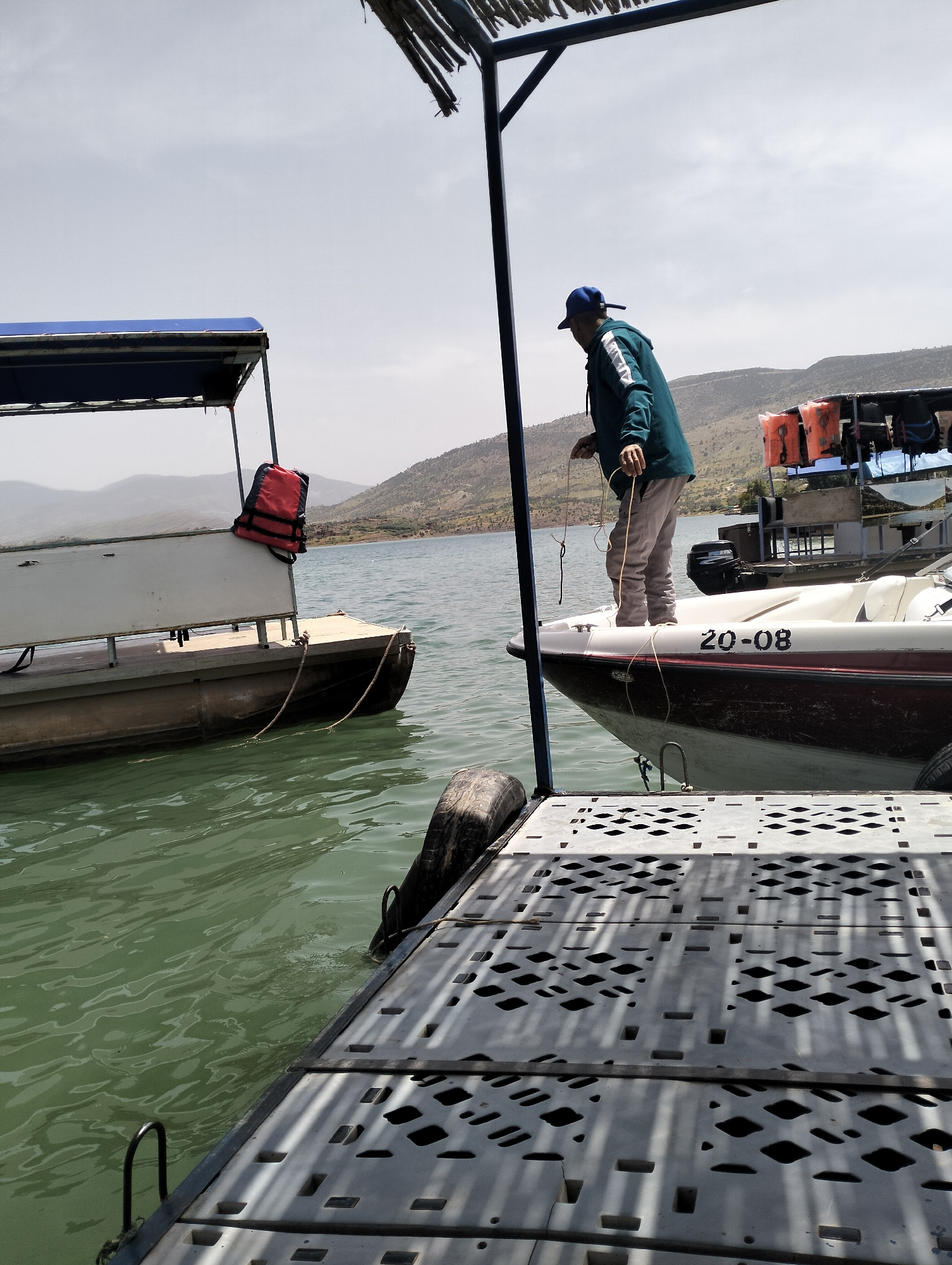 A man stands on a boat at a dock on the Bin El Ouidane Lake, Morocco. The man is wearing a blue cap, a teal jacket with white stripes, and light-colored pants. He is holding a rope in his hands. The b…read more