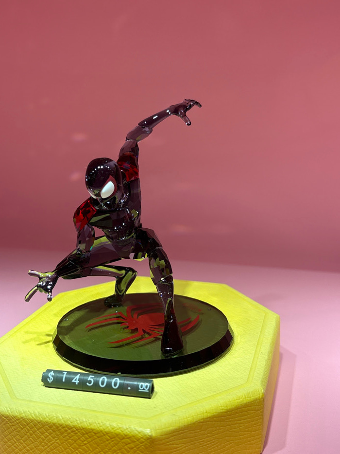 A faceted crystal figurine depicting Miles Morales, also known as Spider-Man, is displayed in a crouching, dynamic pose with arms extended, against a solid pink background. The figurine is primarily d…read more