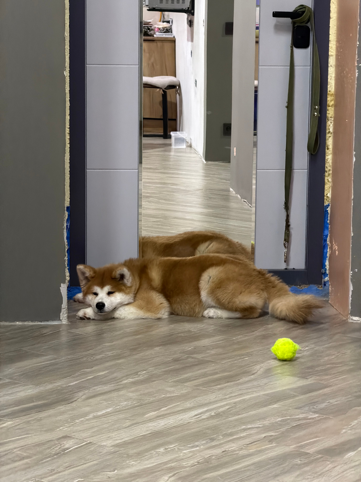 A dog lies on a wood-grain-patterned floor next to a tennis ball. The floor is adjacent to a partially-installed wall or cabinet with light gray panels and a dark blue base. A green leash hangs on the…read more