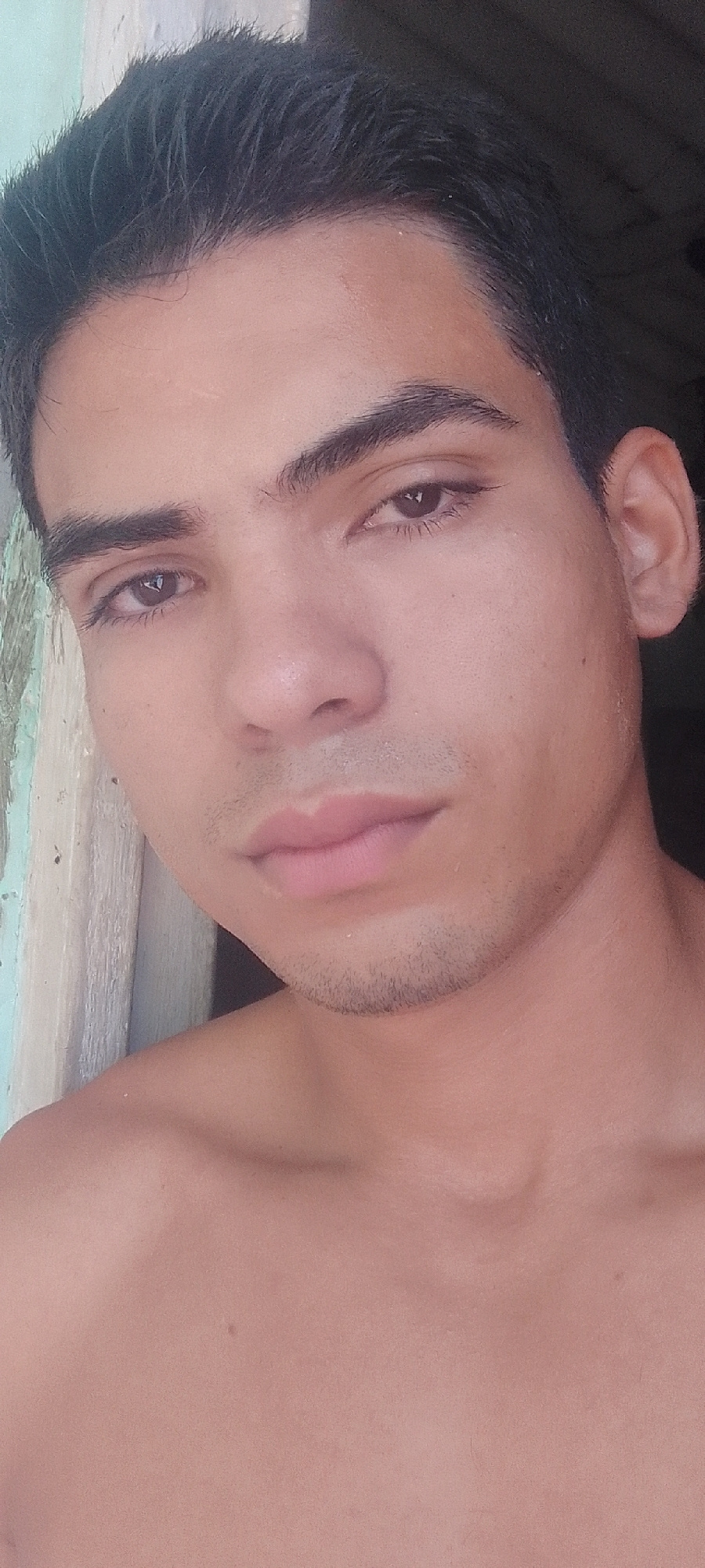 A close-up shot of a fair-skinned young man with dark hair and brown eyes. He has a short beard. The background shows a peeling wall with light green paint. He is shirtless, and the image appears to b…read more