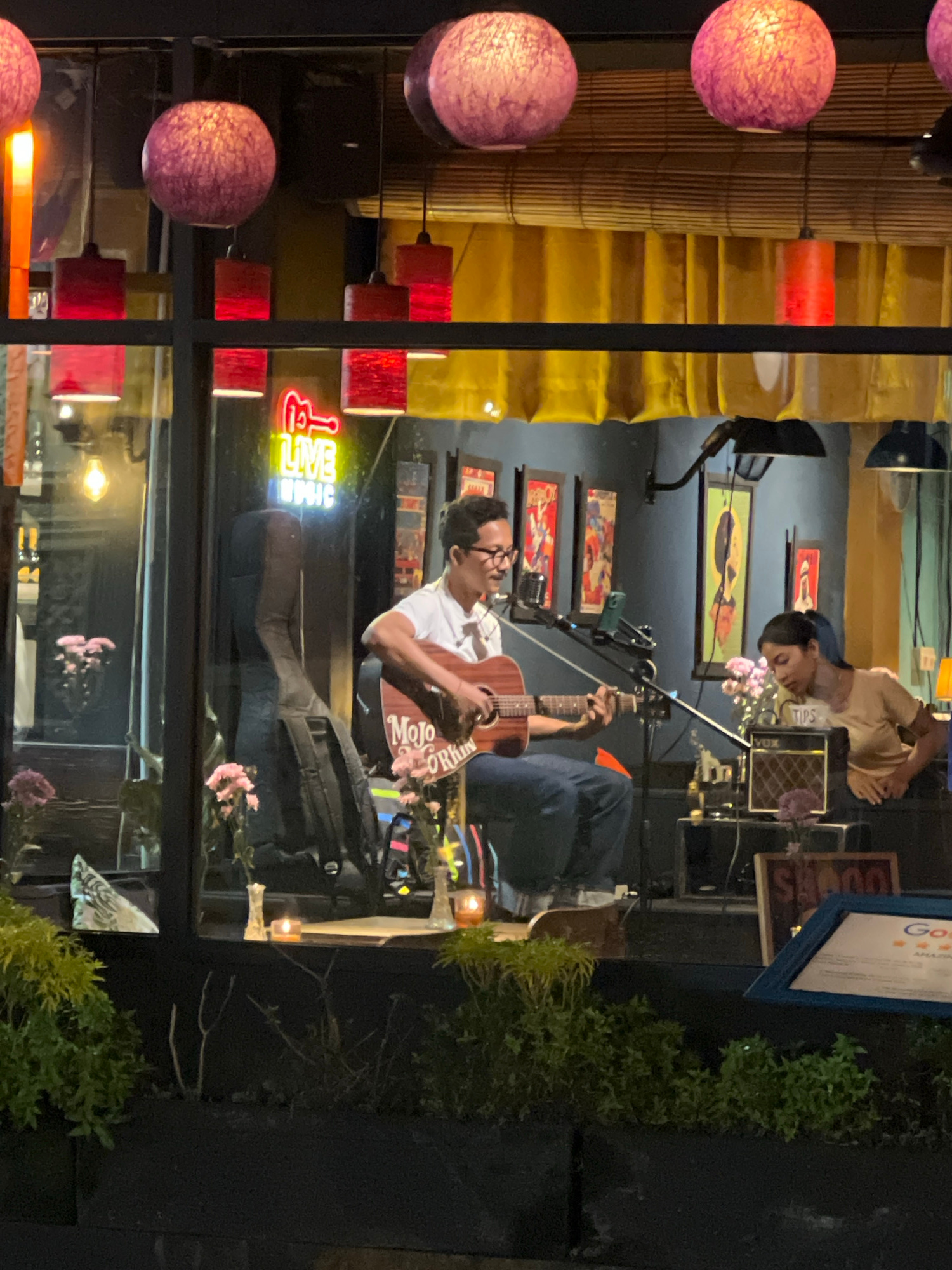 The image shows a man playing an acoustic guitar in what appears to be a live music venue. The guitar has the words "Mojo Workin'" written on it. Another person is sitting in the background. There are…read more