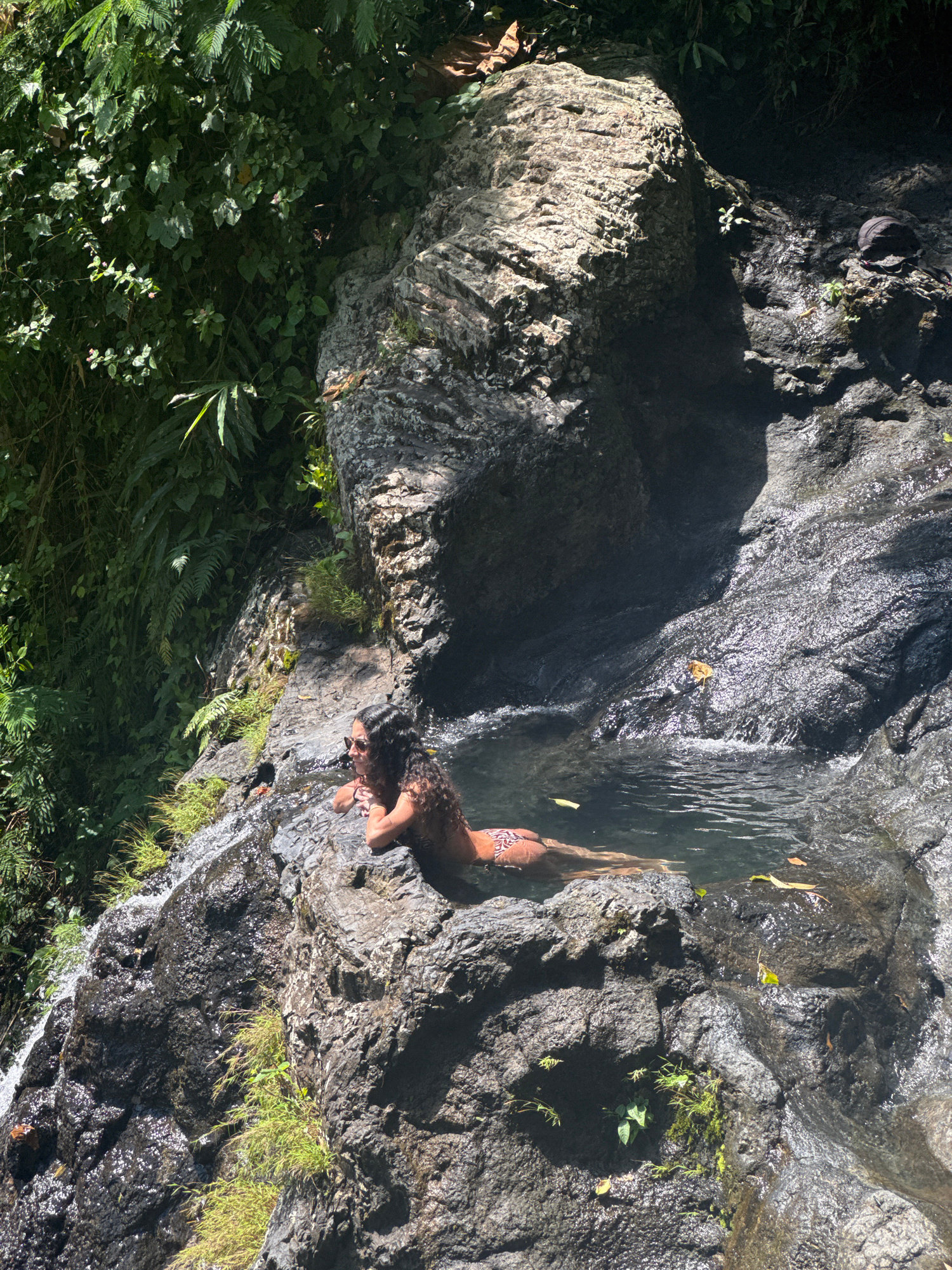 The image captures a serene natural scene, presented as if rotated 90 degrees counter-clockwise. It shows a person, likely a woman, with dark, curly hair, partially submerged in a clear, rocky pool, a…read more