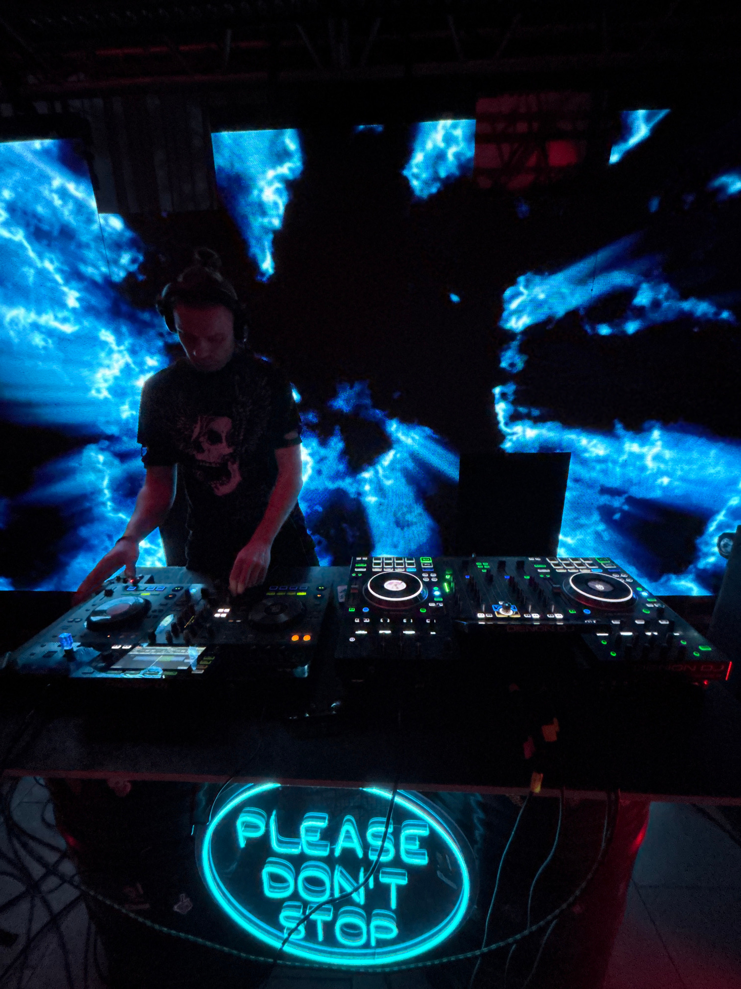 The image shows a DJ performing at a nightclub. He stands behind a DJ booth with a Denon DJ setup, including CDJs and a mixer. The background features a large LED screen displaying abstract blue visua…read more