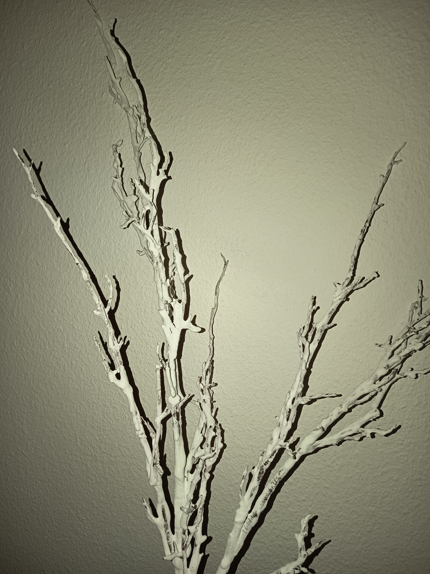 The image shows a close-up of several dried, white-painted branches against a light-gray, textured wall. The branches are bare, with numerous smaller twigs and offshoots. The lighting is uneven, casti…read more