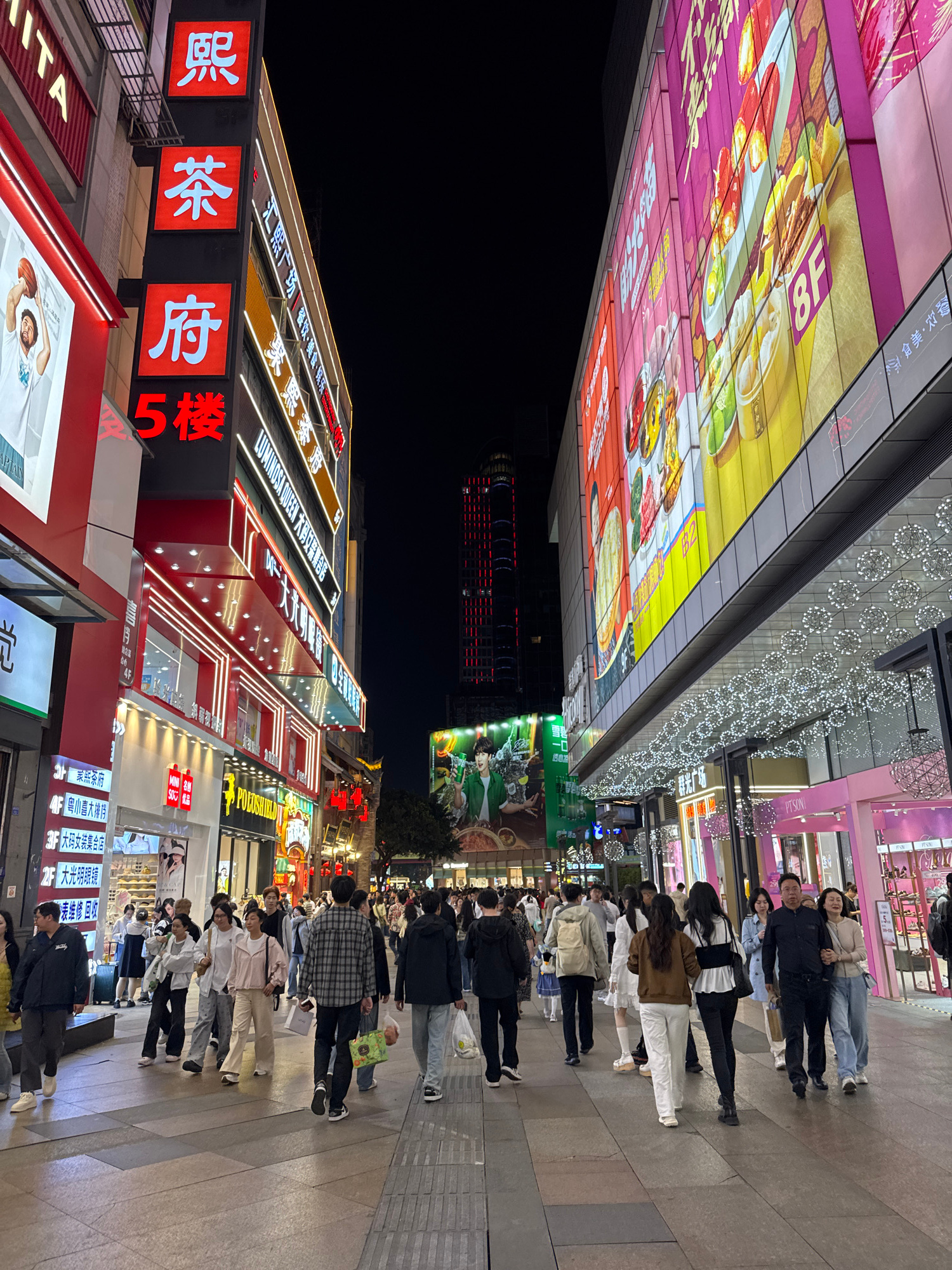 Captured at night in the Jinjiang District of Chengdu, China, the image depicts a bustling commercial street filled with pedestrians. Brightly lit storefronts line the street, with signage in Chinese…read more