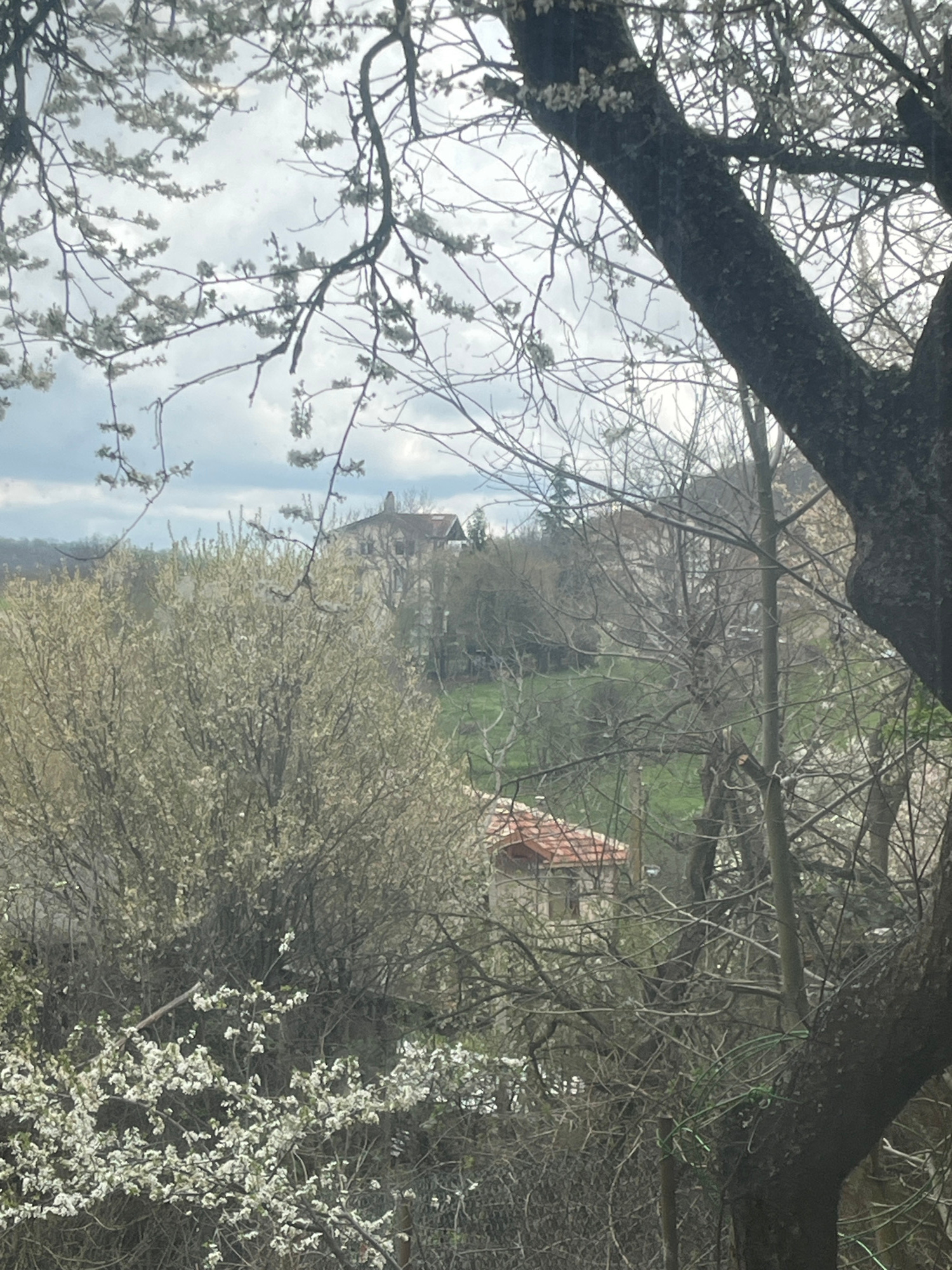 The image shows a view through trees, some with white blossoms, towards a building in Varshilo, Bulgaria. The building appears to be made of stone and has a red tile roof. The sky is visible through t…read more