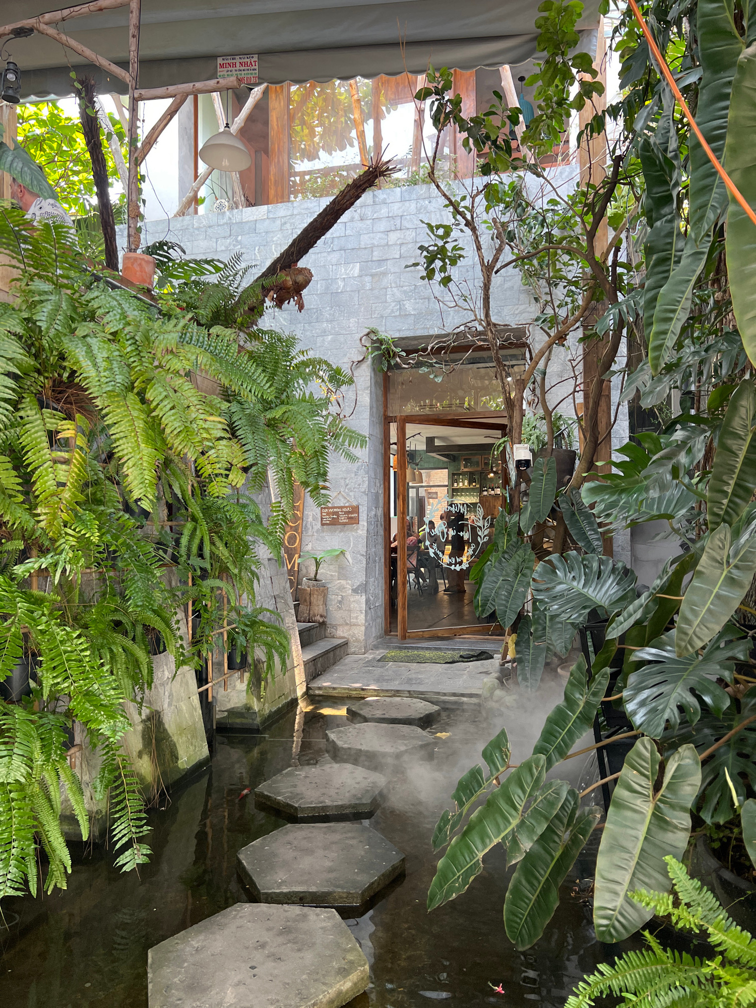 The photograph shows a building entrance located in Nha Trang, Vietnam. The building is constructed from gray brick. The doorway is framed in wood. A pond containing stepping stones is situated in fro…read more