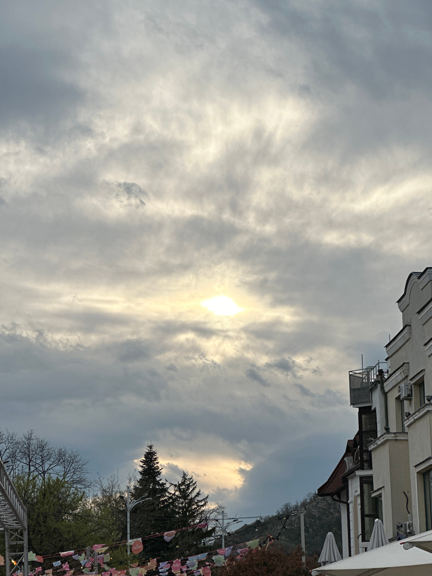 A vertical, upward-angled shot captures a partially obscured sun amidst a heavily clouded sky, adjacent to sections of architecture and foliage, likely taken in or near the city of Plovdiv, Bulgaria.…read more