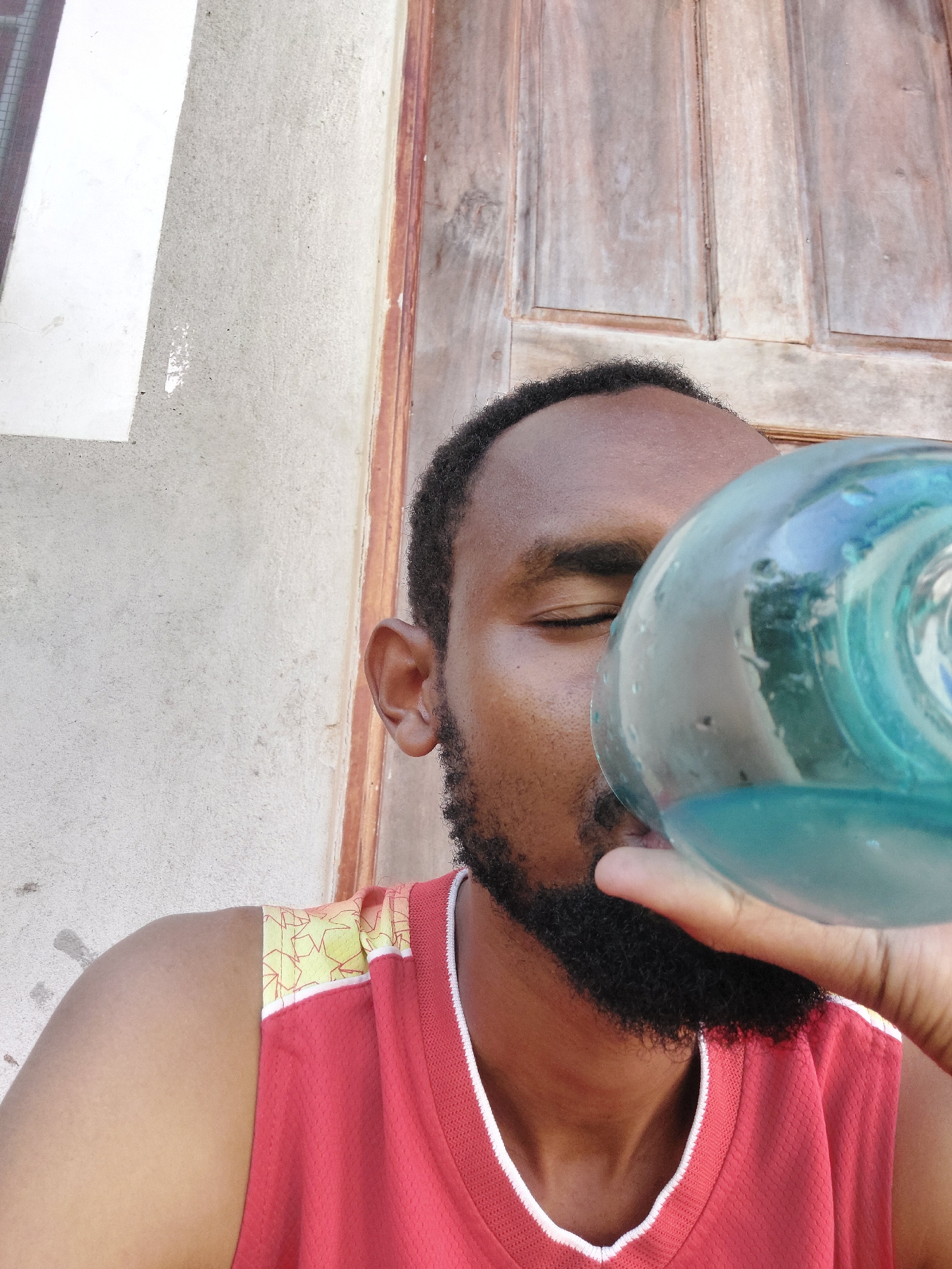 A close-up shot shows a dark-skinned person with a beard holding a light blue glass object to their face. The person's eyes are closed, and their head is positioned diagonally within the frame. The pe…read more