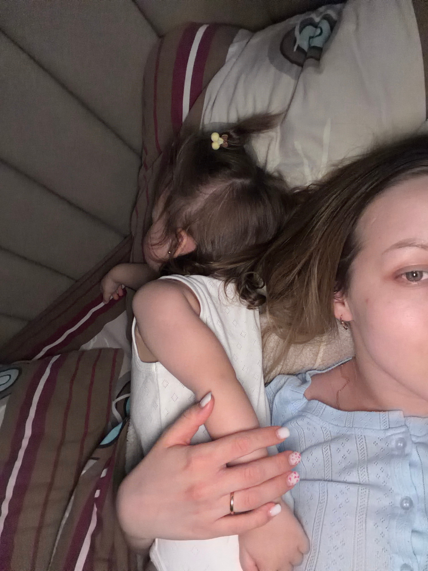A woman and a young child are lying on a bed or couch with patterned bedding. The woman is partially visible, showing her face and upper torso, wearing a light blue shirt. Her hand with a gold ring an…read more