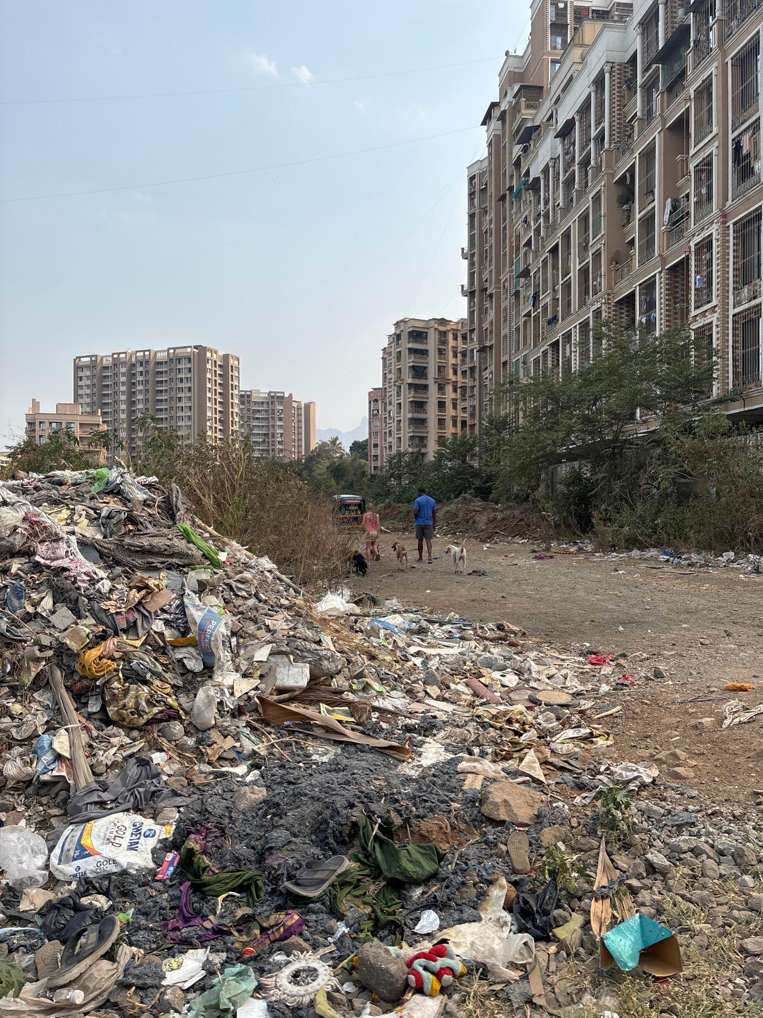 The scene is an unpaved urban area in Ambernath, India, observed under a clear daytime sky. A substantial, irregular mound of mixed refuse, consisting of plastic bags, assorted textiles, construction…read more