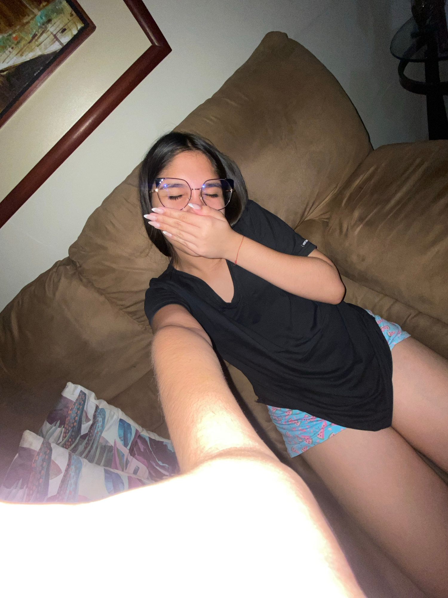 A young woman lies on a brown sofa, wearing a black shirt and patterned shorts. She is covering her mouth with her hand and wearing glasses. A framed painting is visible on the left. A brightly lit ob…read more