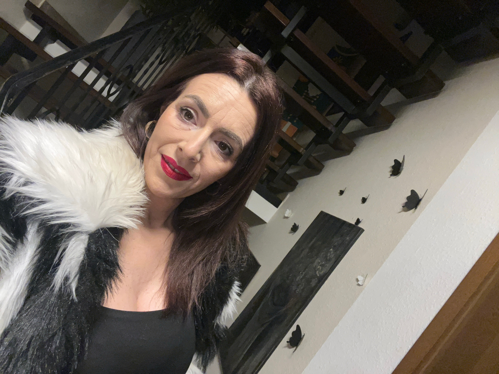 A woman with dark brown hair, fair skin, and red lipstick stands indoors in front of a staircase. She wears a black top and a black and white faux fur jacket. Decorations of black butterflies are visi…read more
