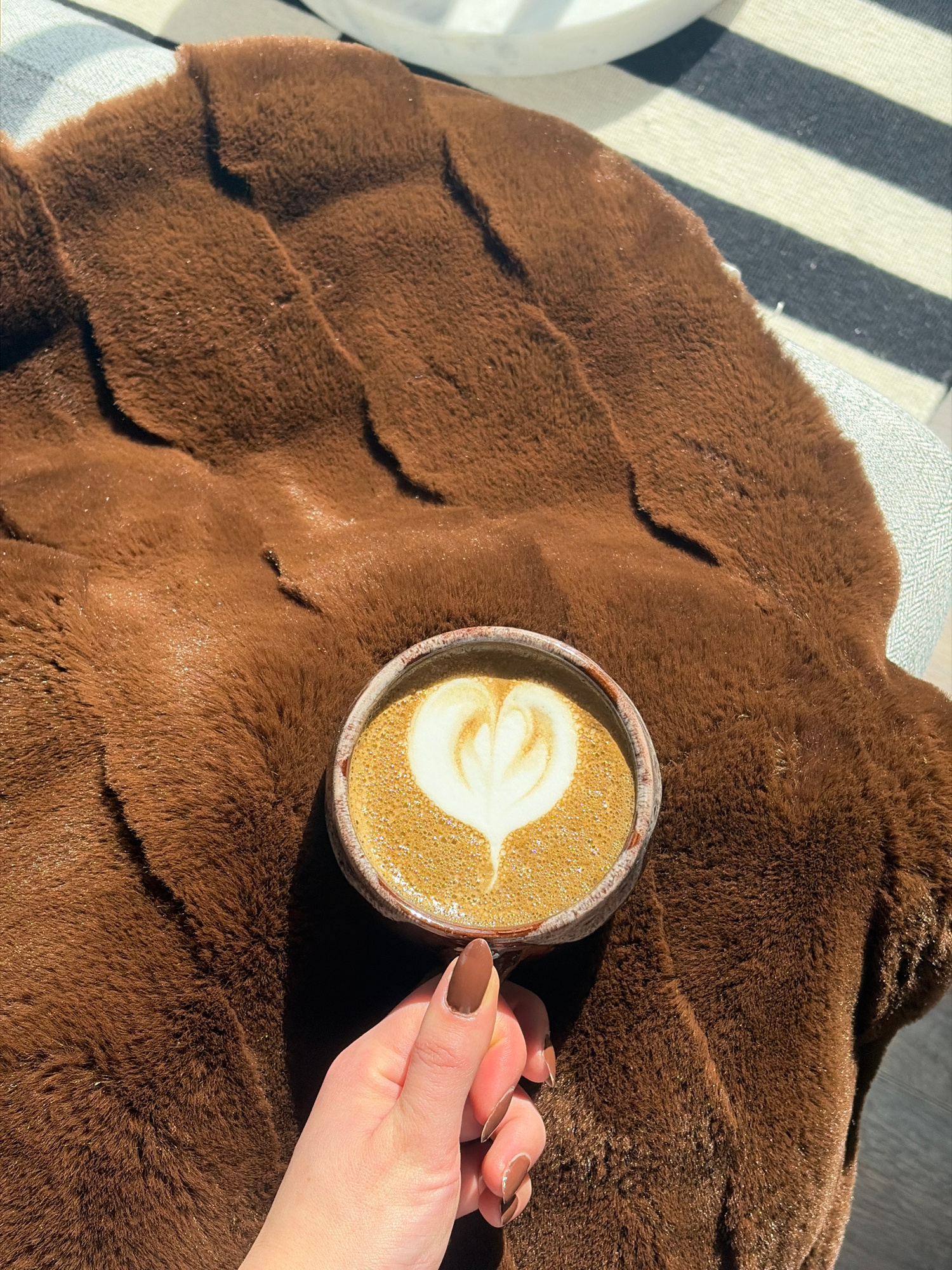 A high-angle shot depicts a cup of coffee resting on a textured, brown, faux-fur material. The coffee cup is round with a light-colored exterior and a beige interior filled with coffee, featuring latt…read more