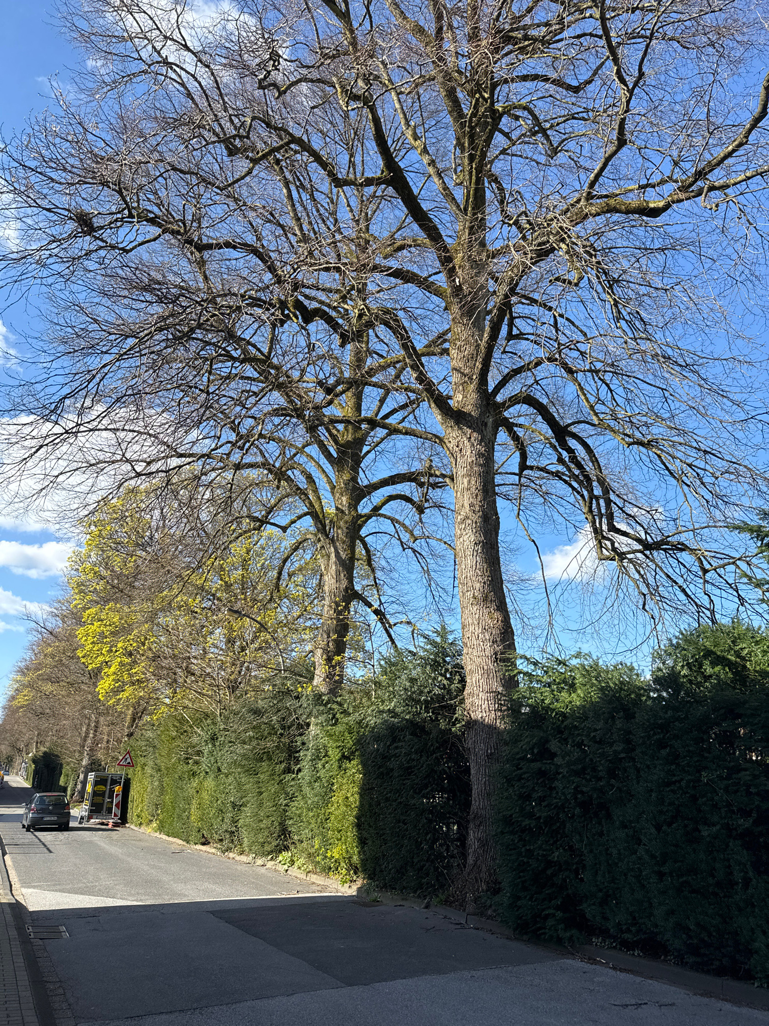 The image depicts a street scene in Remscheid, Germany. A mature tree, mostly bare of leaves, dominates the upper portion of the frame, its branches reaching across a blue sky with scattered clouds. T…read more