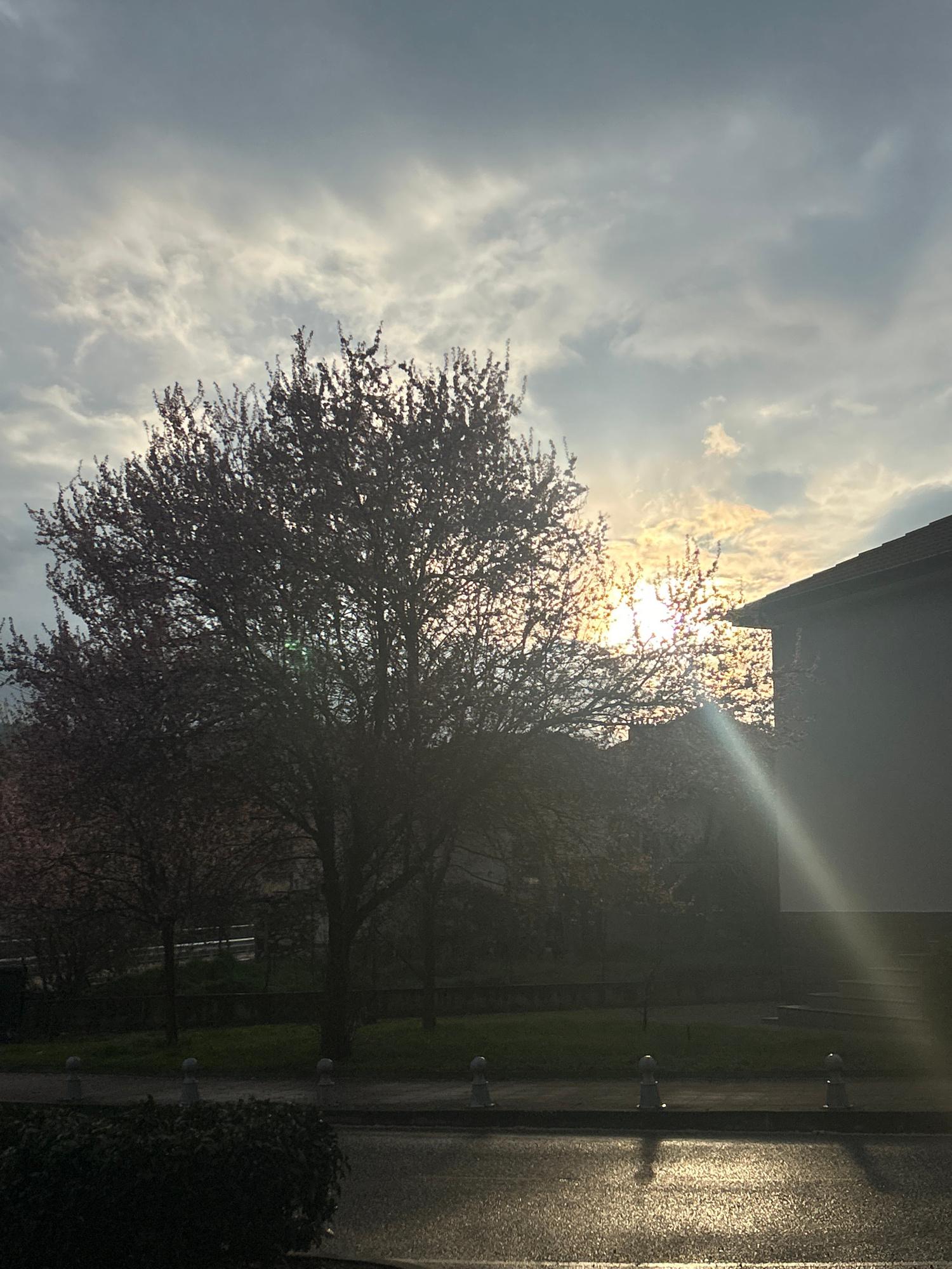 The image presents an outdoor scene with the sun obscured by clouds and silhouetted trees. A building's edge is visible at the top right, with light refracting off its surface. A wet road runs along t…read more