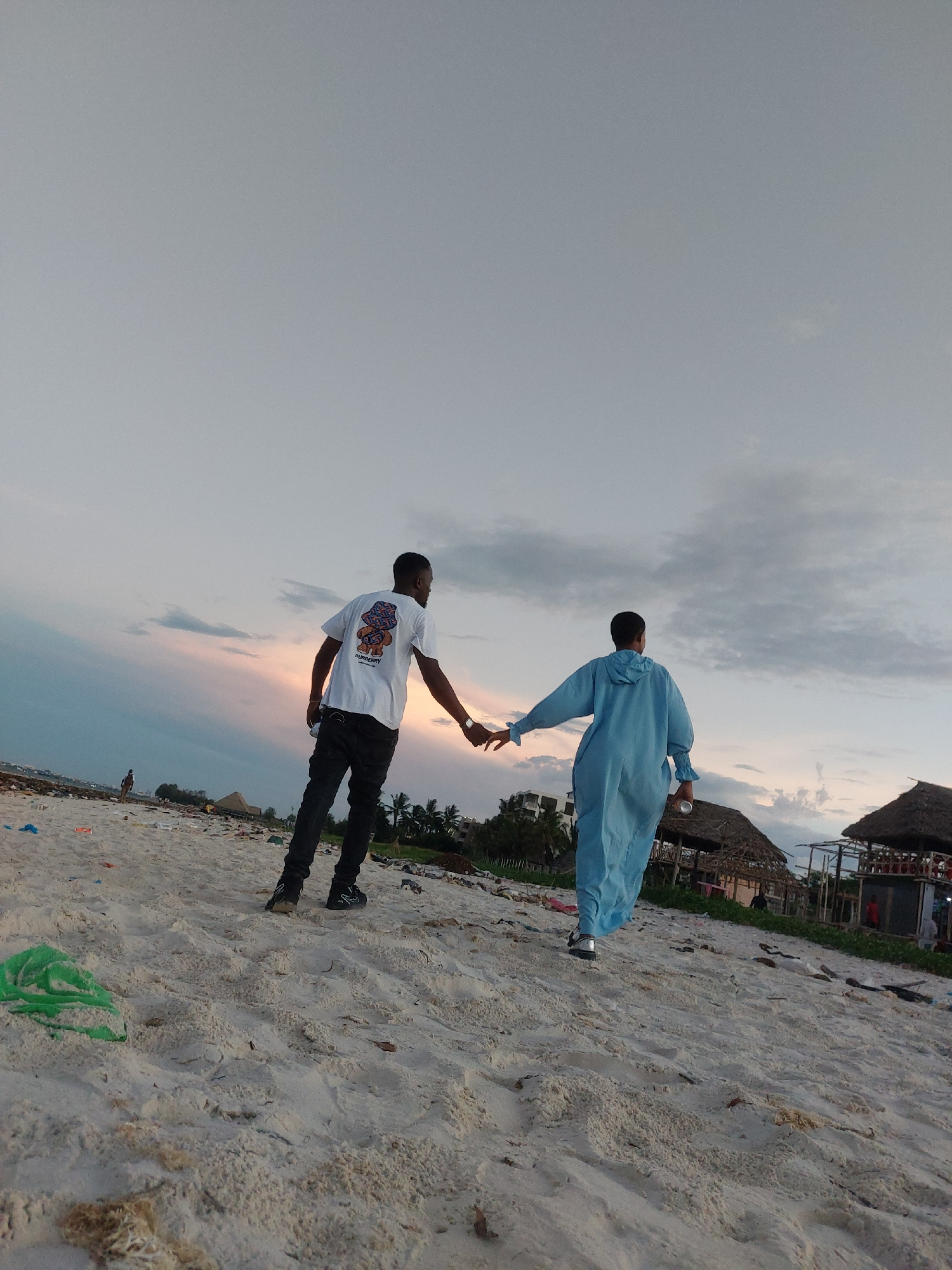 The photo depicts a scene on a beach in Dar es-Salaam, Tanzania. Two young men are interacting. One man, wearing a white t-shirt and dark pants, reaches out and touches the hand of another man, who is…read more