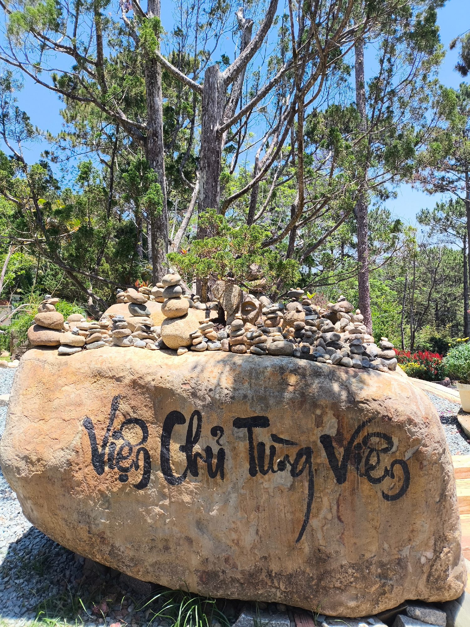 The image shows a large boulder with the words "Viện Chỉ Từng Viên" painted in black on its surface. The top of the boulder is covered with stacks of small rocks, creating numerous miniature cairns. The boulder is situated in an outdoor setting, surrounded by trees, suggesting a park or garden environment. In the background, there is a mix of evergreen trees and glimpses of other vegetation, including some flowering plants. The sky is visible in the upper portion of the image, appearing clear and blue. This rock with the writing is located in the city of Da Lat, Vietnam. | Open Wire