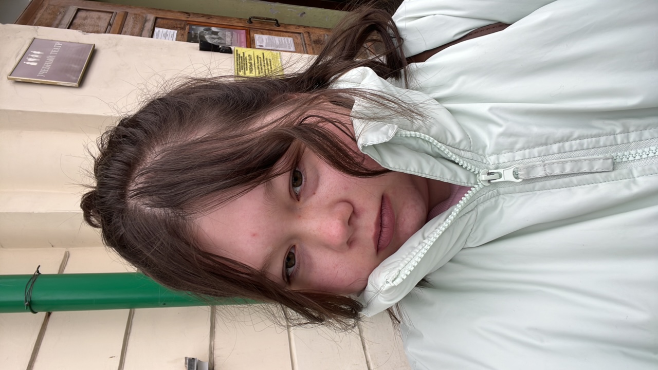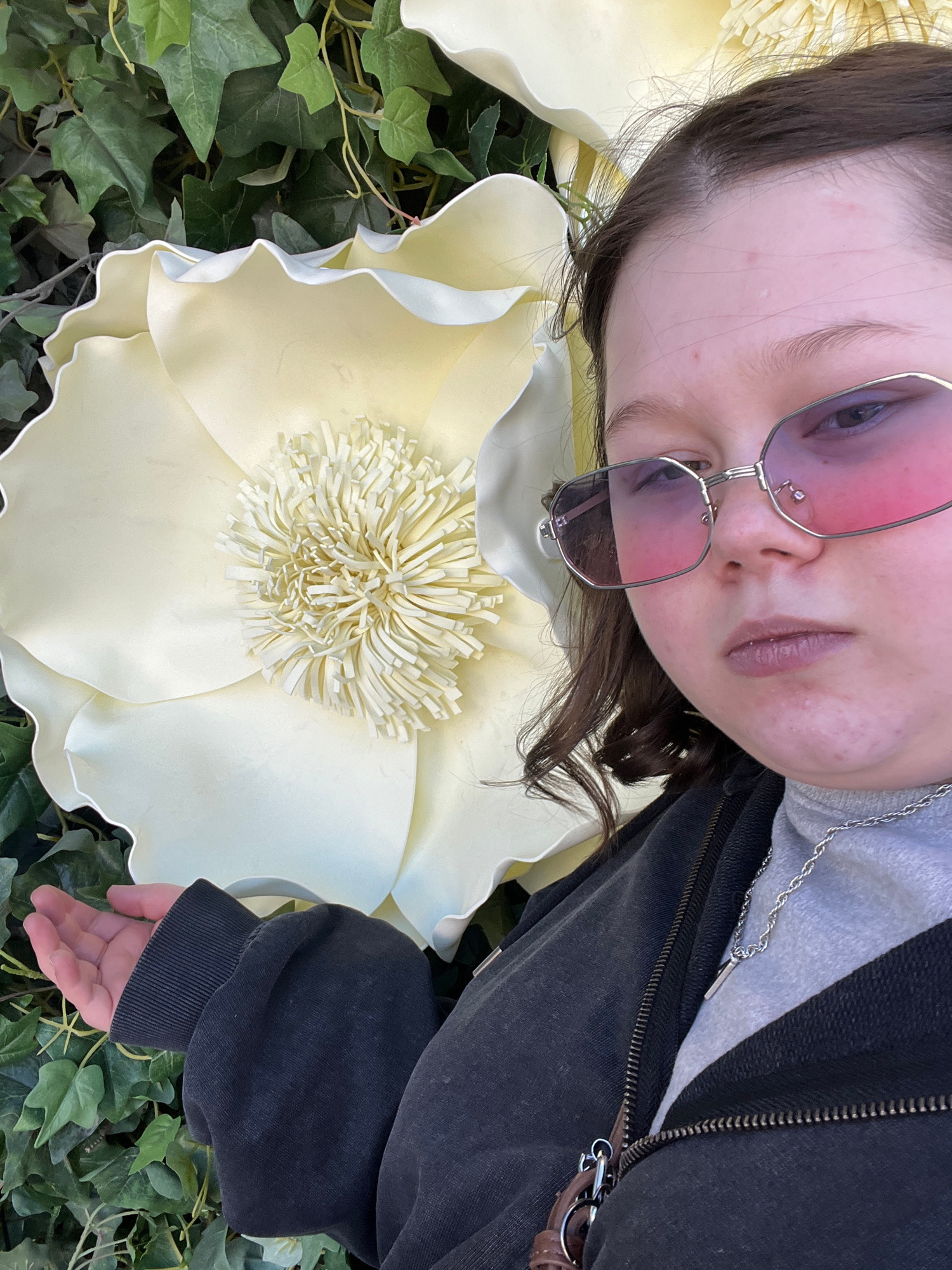 A young person is captured in a close-up, high-angle shot, lying down and looking towards the camera. Their head is tilted, and they wear large, silver-framed, pink-tinted sunglasses that obscure thei…read more
