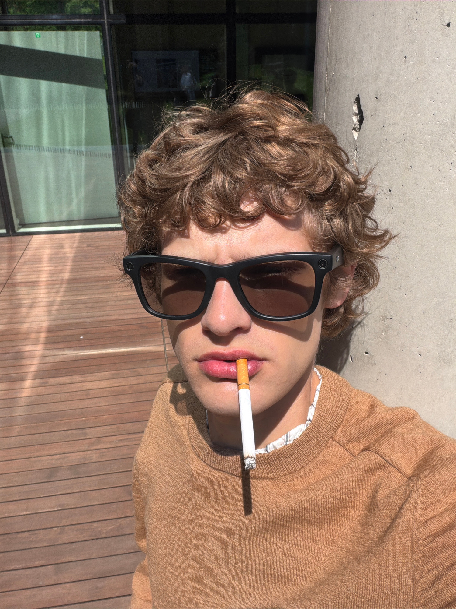 A rotated high-angle shot depicts a person with light brown, curly hair lying down outdoors, under bright sunlight in Mirabella, Italy. The image is rotated 90 degrees clockwise, positioning the perso…read more