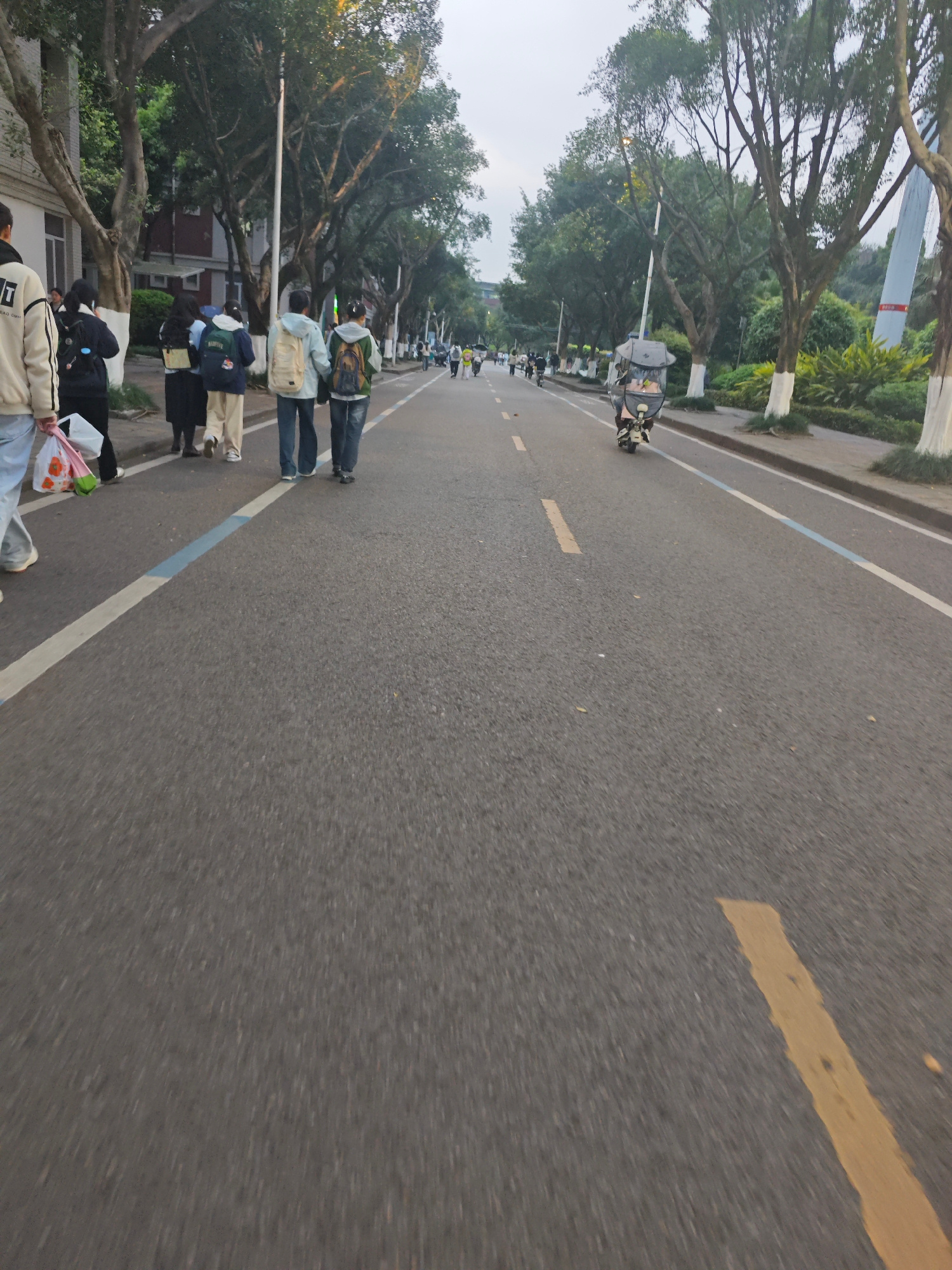 The scene depicts an outdoor street in the Chongqing High-tech Zone, China, observed from a low-angle perspective. The asphalt road surface is dark grey, featuring a solid white line on the left delinβ¦read more