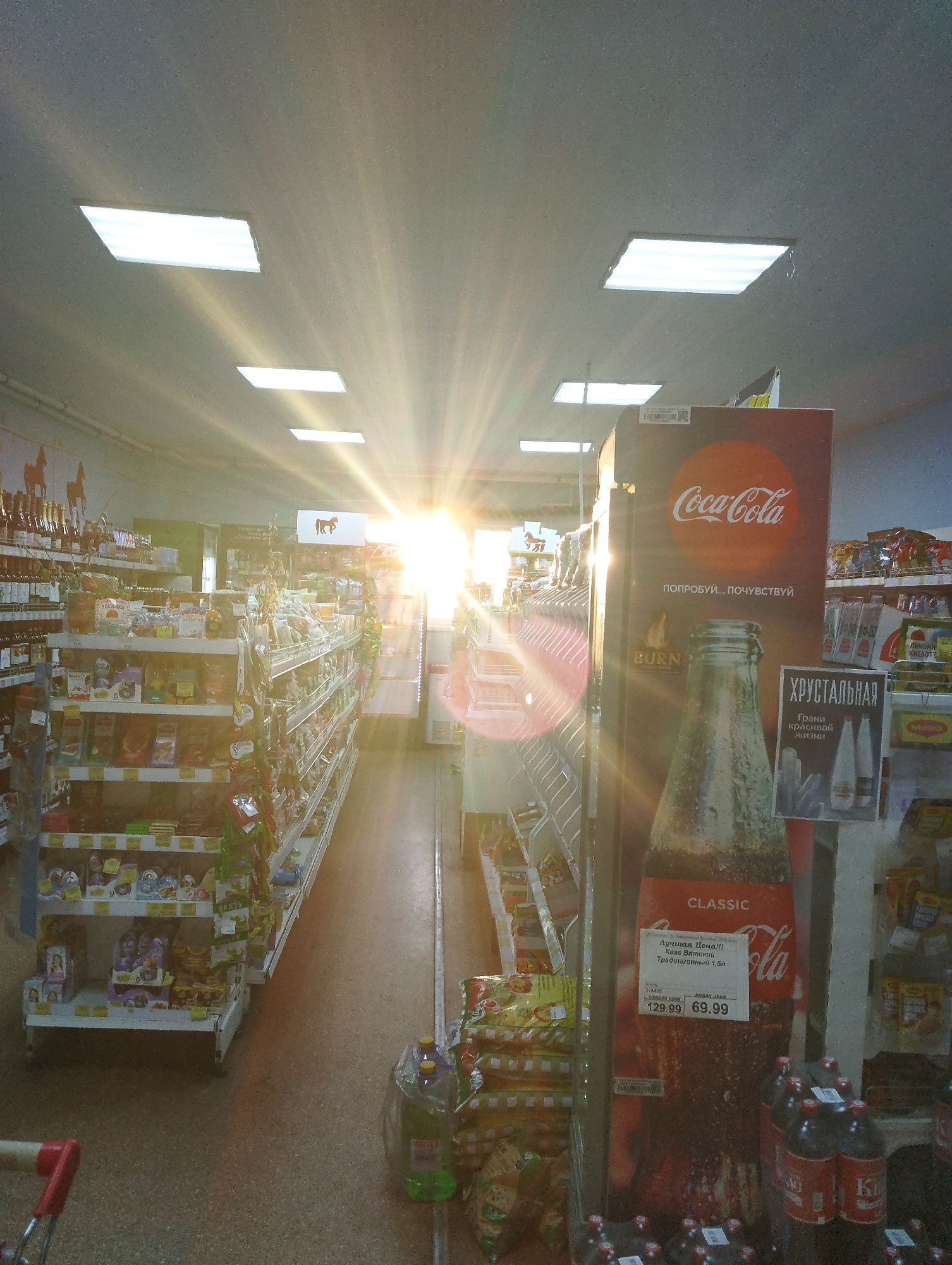 The image shows an aisle in a store, likely a grocery store, in Krasnogorskoye, Russia. Shelves filled with various products line both sides of the aisle. A Coca-Cola advertisement, featuring a bottleβ¦read more