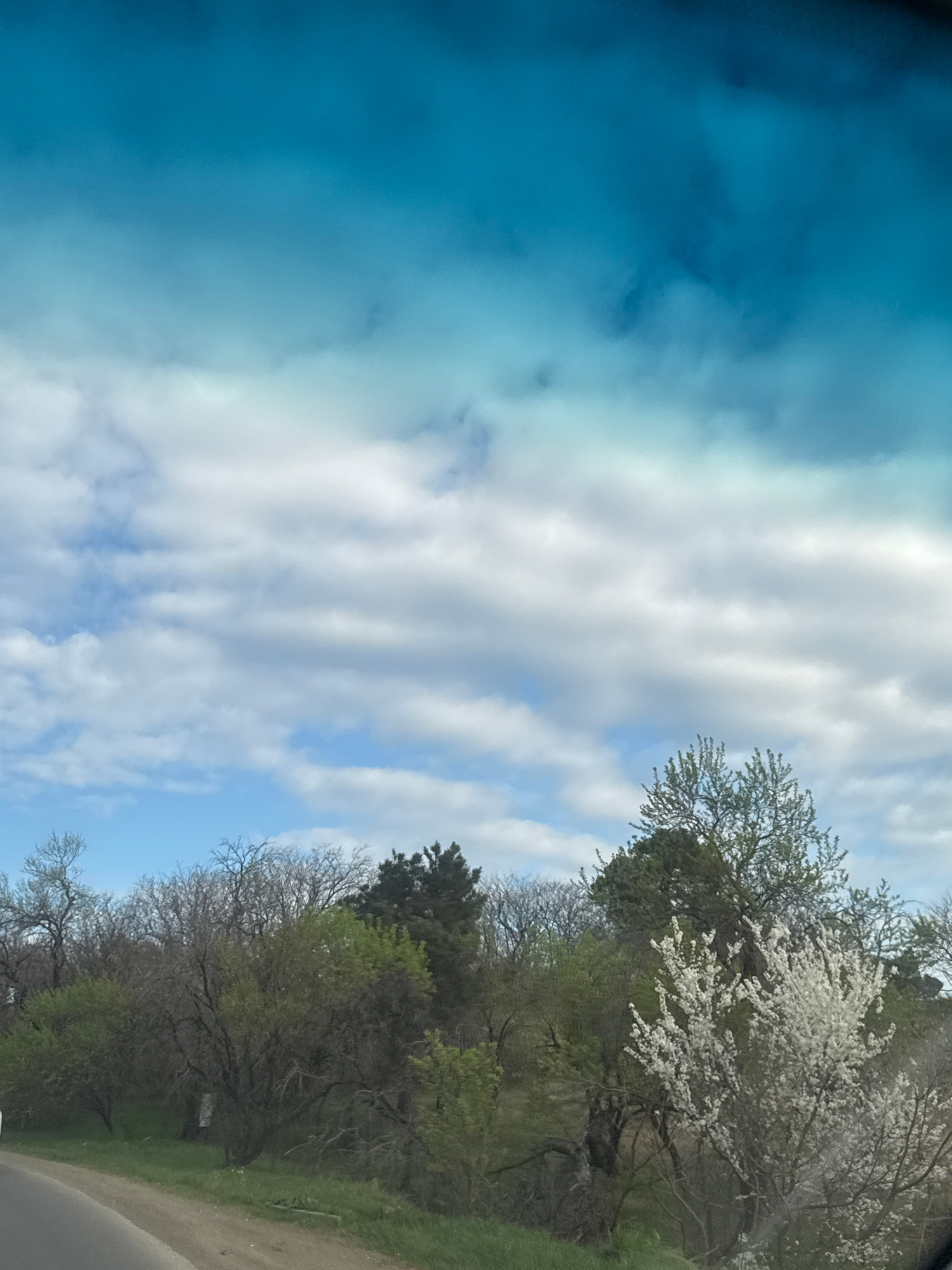 The image shows a view from a car, looking upwards at the sky and trees. The sky is partially covered with white clouds against a blue background. On the right side of the frame, a line of trees is vi…read more
