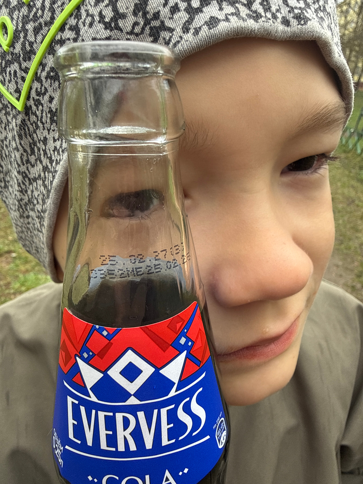 A close-up, rotated image depicts a child lying down next to a glass bottle of "Evervess Cola" with a blue and red label. The child's face, including an eye, nose, and lips, is visible. The reflection…read more
