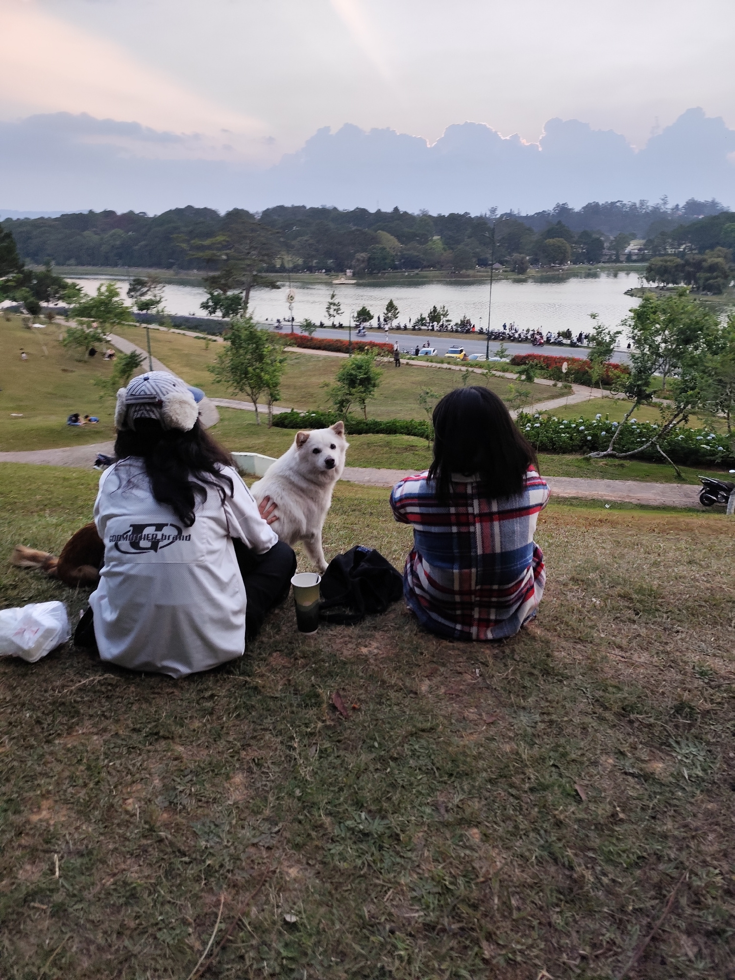 Two women and two dogs are sitting on a grassy hill overlooking Xuan Huong Lake in Da Lat, Lam Dong, Vietnam. One woman wears a white jacket and an ear-flap hat, petting a white dog that is sitting up…read more