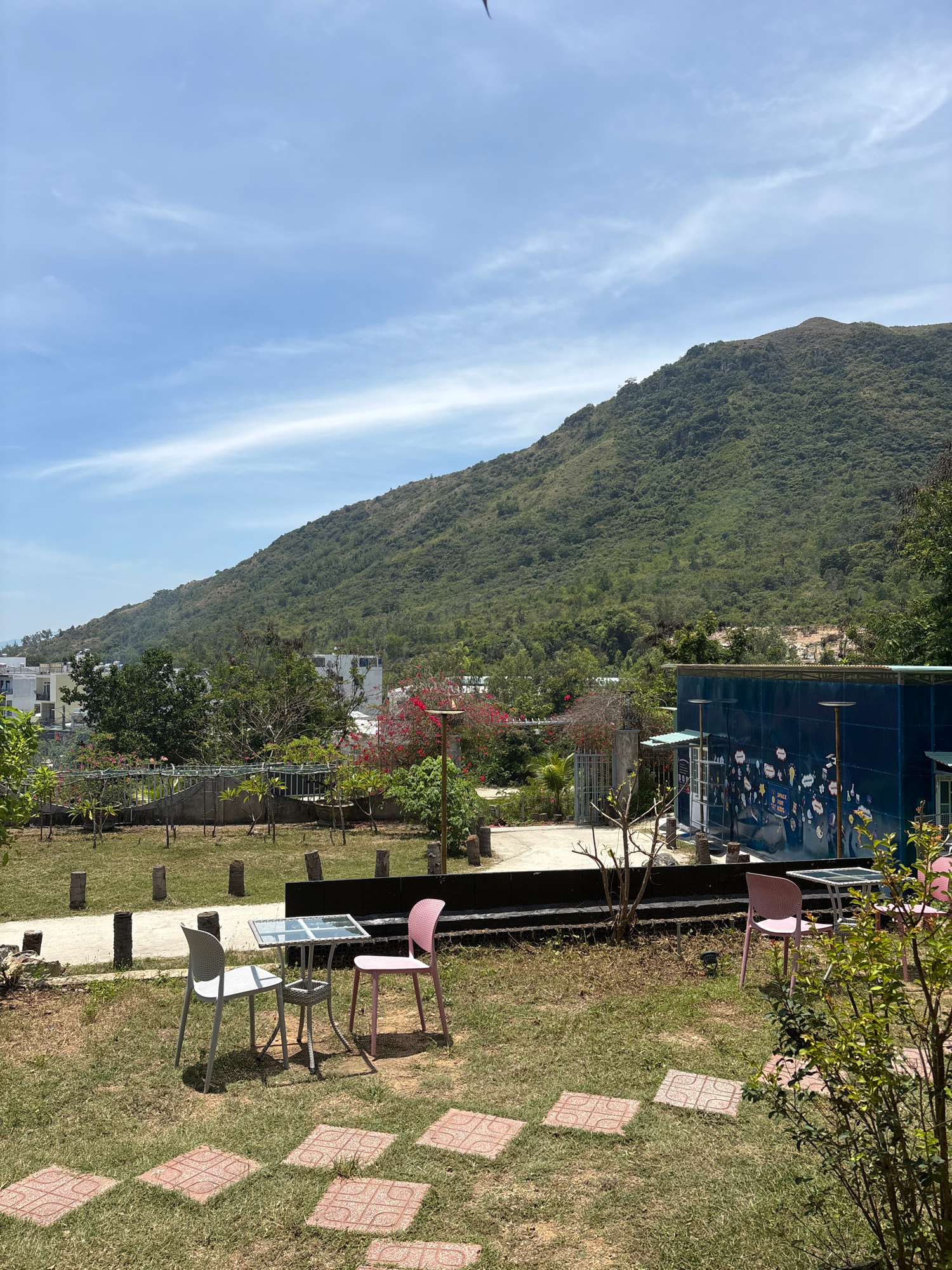 The image depicts a scenic view of a garden and mountain landscape in Nha Trang, Vietnam. In the foreground, there is a well-manicured lawn with pink and white chairs surrounding a glass table. A pave…read more