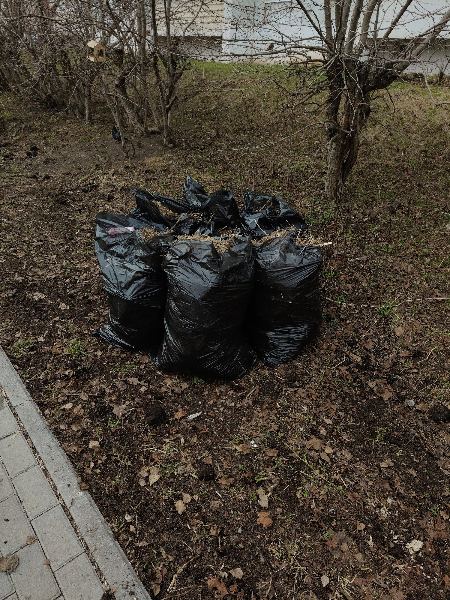The image shows a pile of black trash bags filled with debris, likely yard waste, on a patch of land covered in fallen leaves and dirt. A paved sidewalk borders the lower left of the frame. In the bac…read more