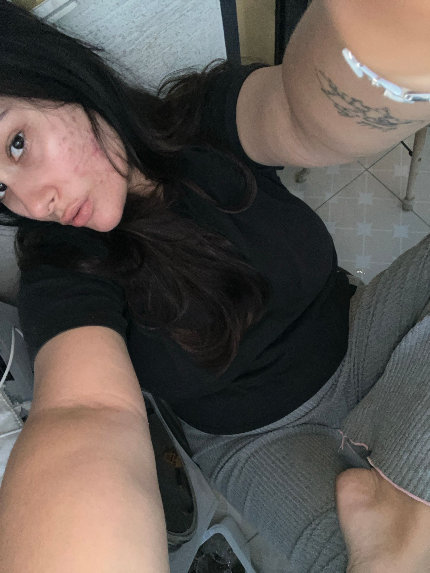 A selfie-style image depicts a person with long, dark hair, wearing a black shirt and gray sweatpants with a pink trim. Their face shows some acne. The person is lying on a light-colored surface, poss…read more