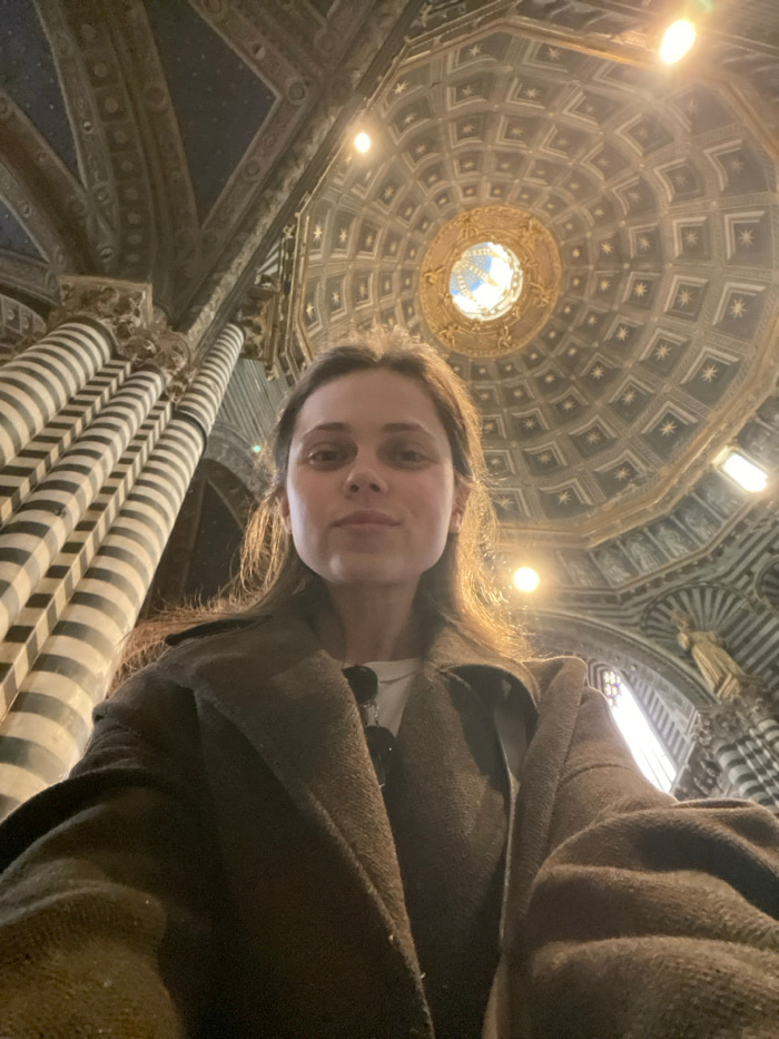A young adult female is depicted in a low-angle selfie taken inside the Siena Cathedral (Duomo di Siena) in Siena, Italy. She has light skin, long brown hair, and is wearing a dark brown overcoat overβ¦read more