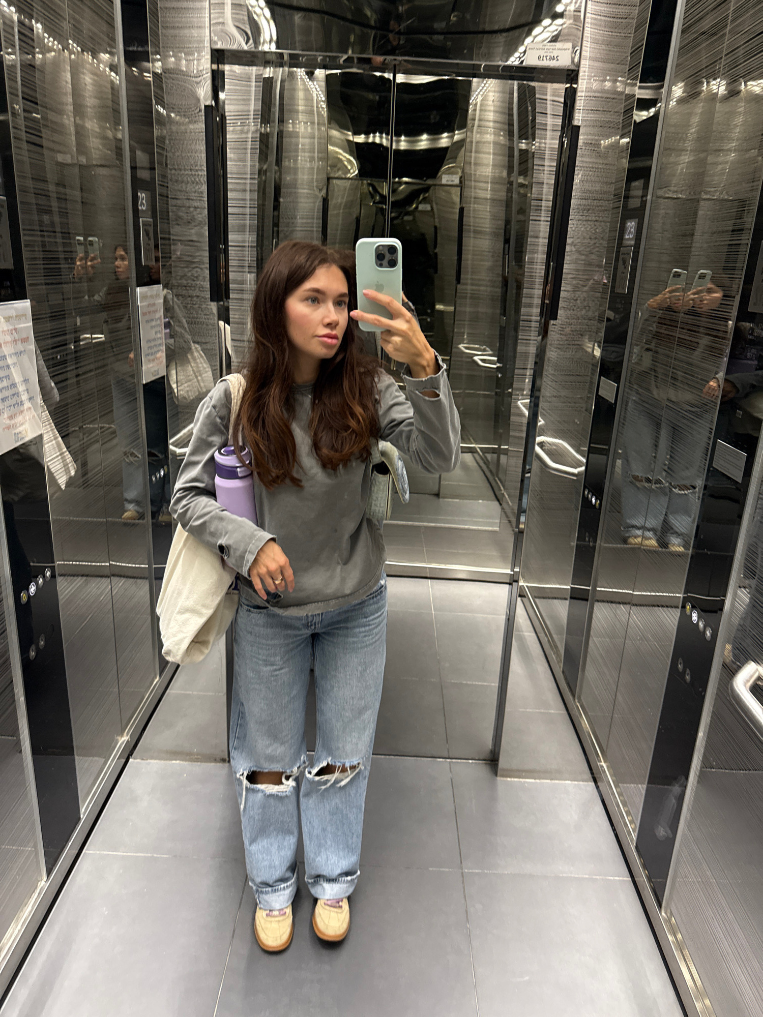 A young woman stands in a modern, mirrored elevator, possibly in Tel-Aviv, Israel. She is taking a selfie with a light green smartphone, holding it in her right hand. She has long, dark brown hair, a…read more