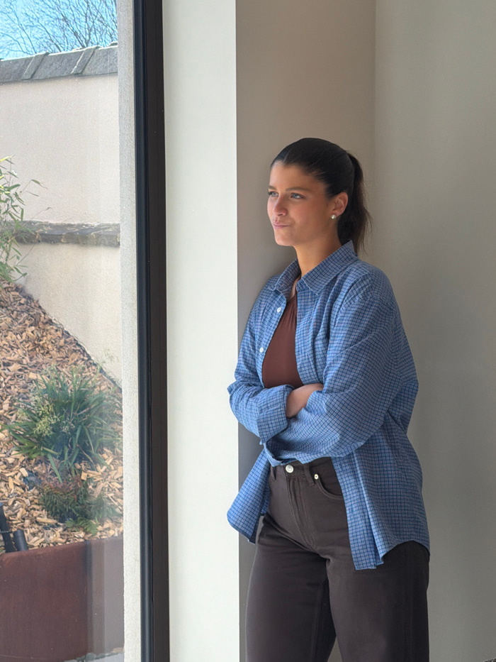 The scene is set indoors, within the city of Marche-lez-Écaussinnes, Belgium. A female subject is positioned in profile, standing near a large window with a black frame, leaning against a light-colore…read more