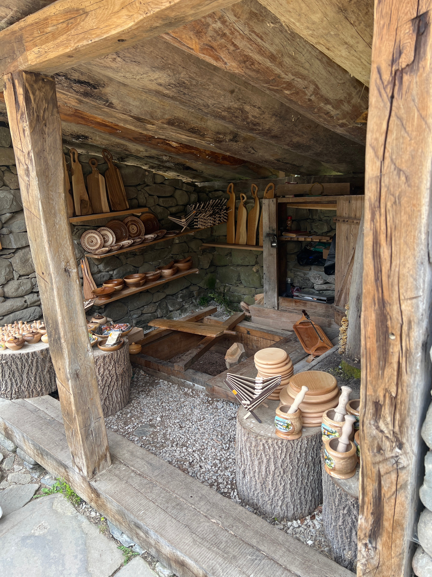 The image shows a view from within a wooden structure with stone walls, displaying various wooden handcrafted items for sale. The location is likely in or near Gabrovo, Bulgaria, known for its crafts.…read more