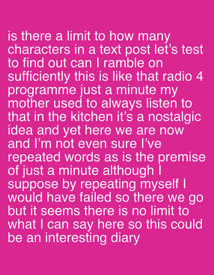 The image is a digital graphic consisting of white text against a solid pink background. The text is written in a conversational style, discussing the potential character limit of a text post and refl…read more