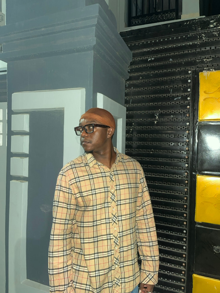 A man with a brown head covering and glasses lies on a gray structure. He wears a plaid shirt with light and dark brown squares. The structure is a gray and white concrete architectural detail. Behind…read more