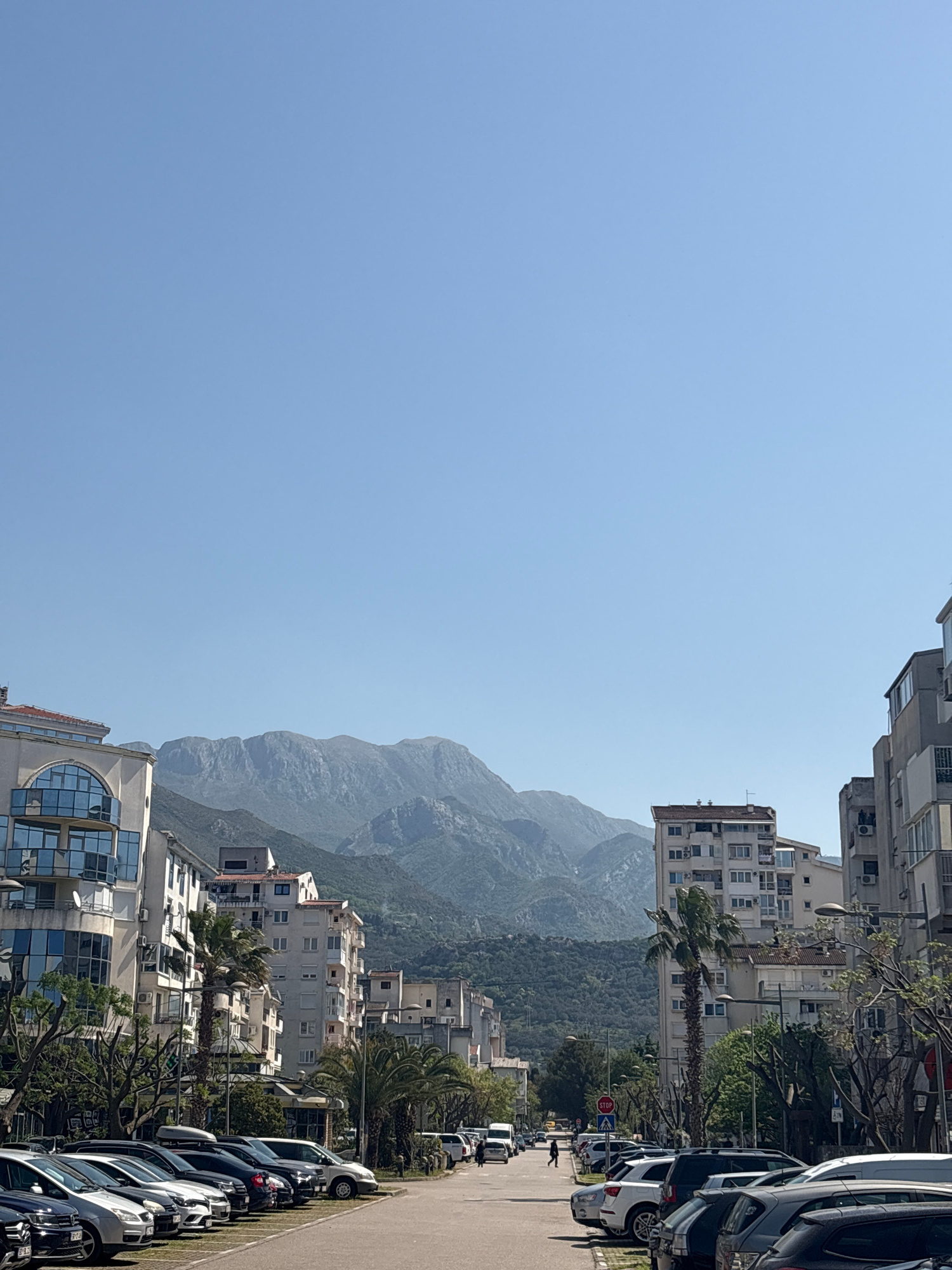 This image captures a bright, sunny daytime street scene in Bar, Montenegro, with a prominent mountain range in the background. The upper left portion of the image shows a clear, light blue sky with n…read more