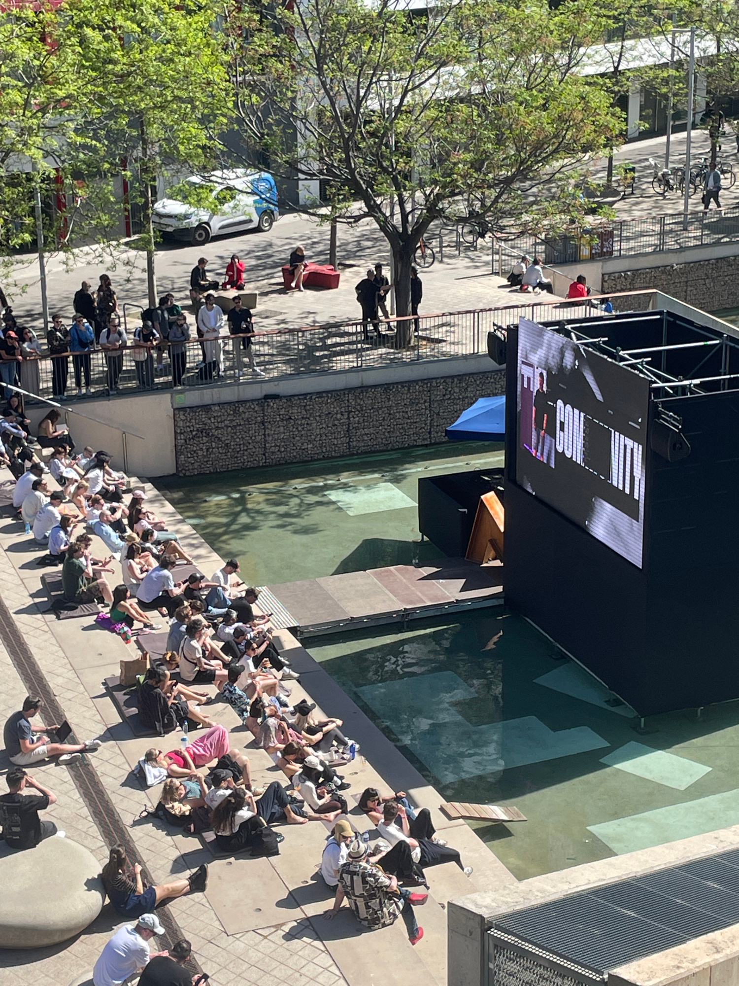 The image shows a crowd of people gathered in a public space, likely in Barcelona, Spain. They are seated or lying down on the ground, facing a large outdoor screen that is mounted on a stage-like str…read more