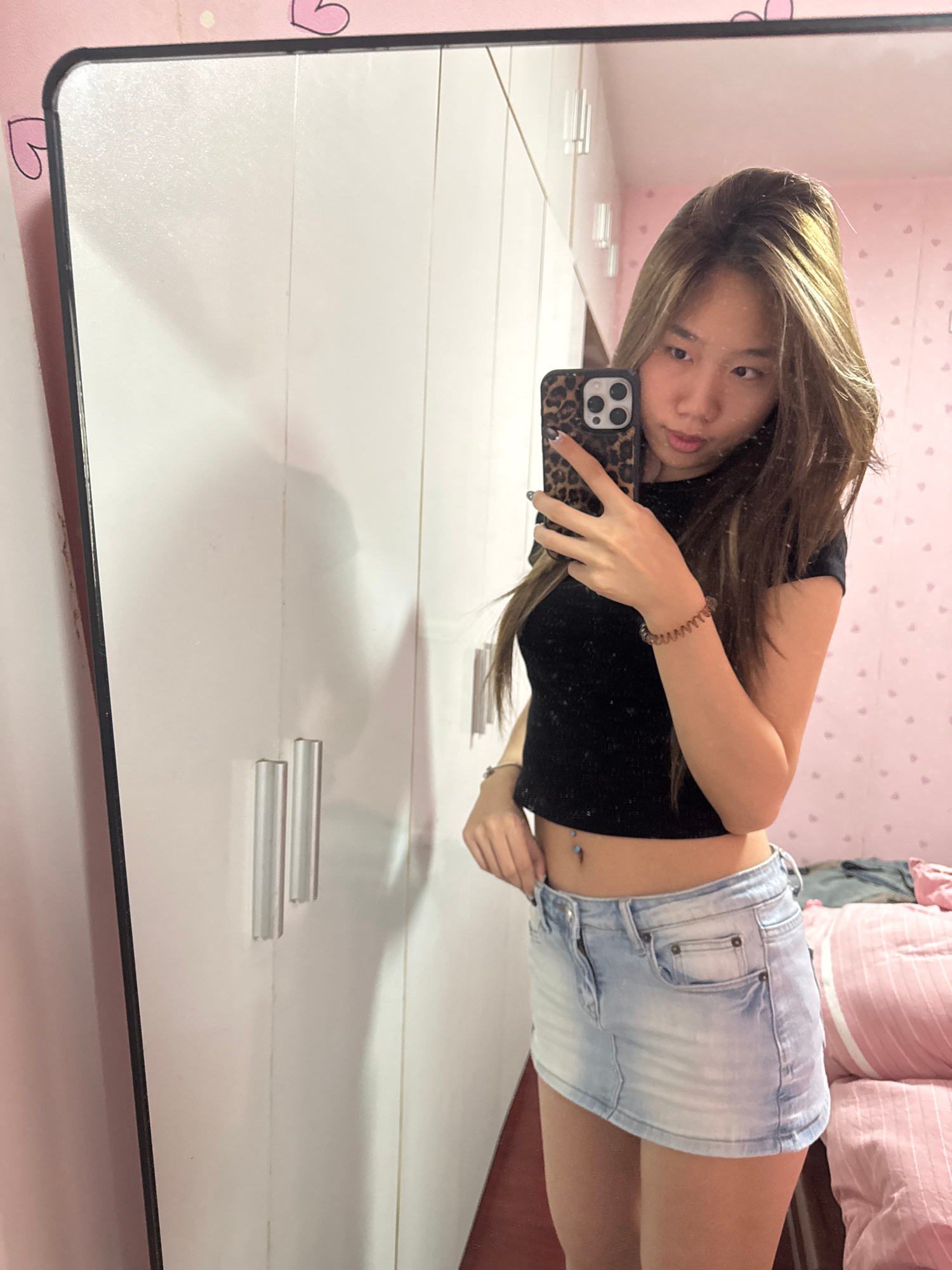 A young woman is taking a selfie in a mirror. She is wearing a black crop top and a short denim skirt. She has long brown hair with blonde highlights. Her phone has a leopard print case. The backgroun…read more