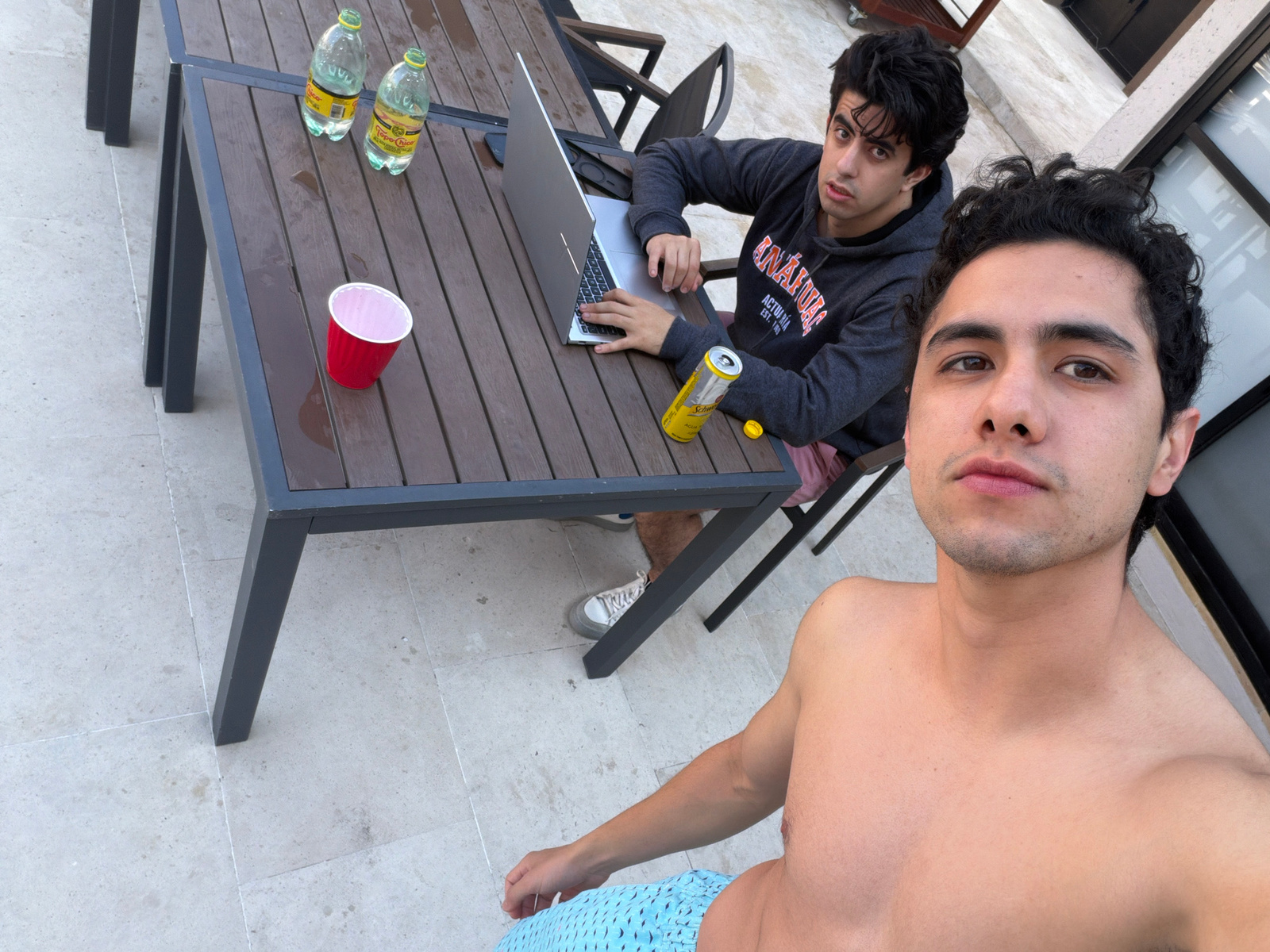 Two men pose for a selfie outdoors. One man, wearing blue swim trunks and no shirt, holds the camera. Behind him, another man sits at a wooden table using a laptop. The second man wears a dark grey ho…read more