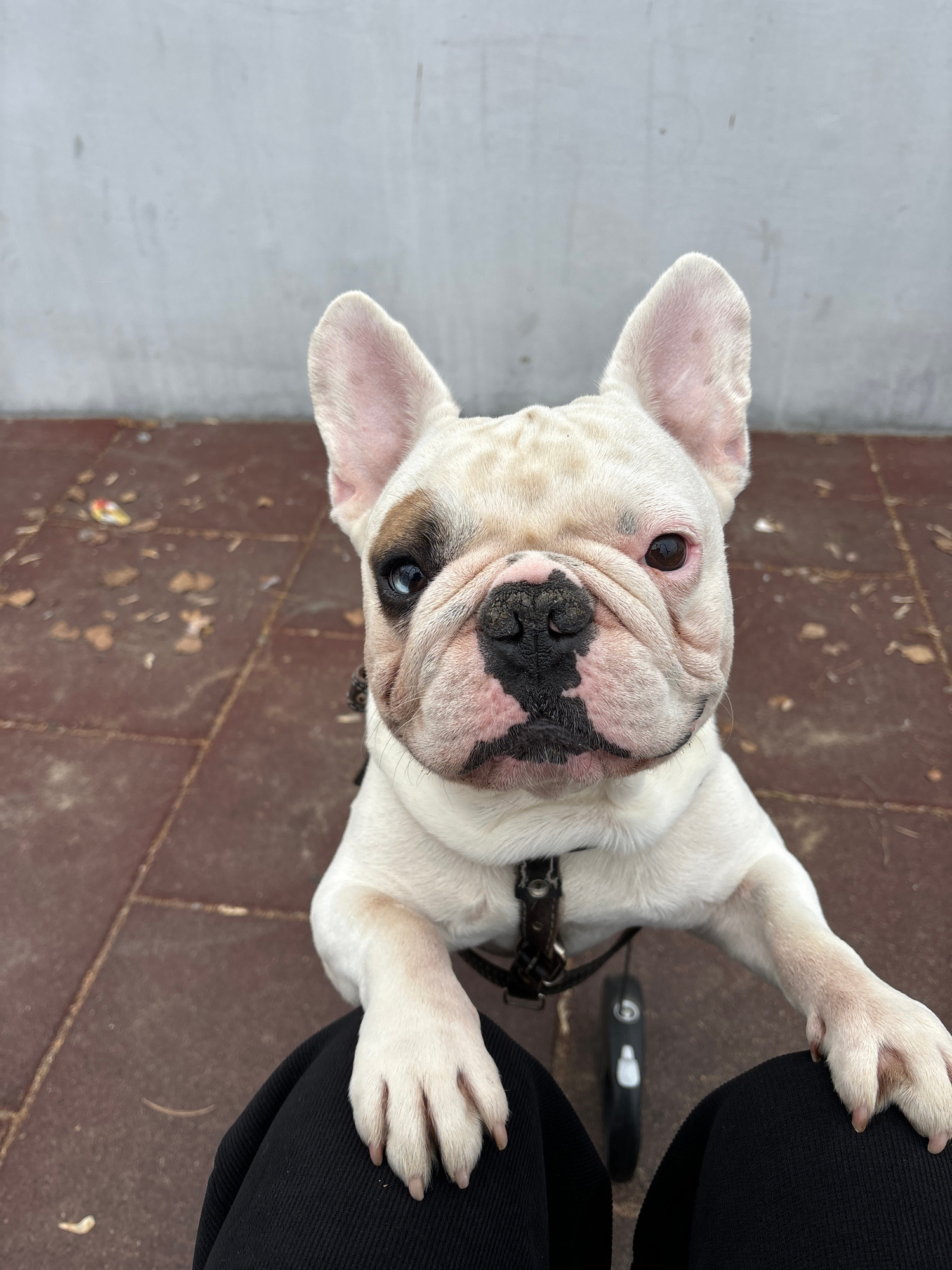 An overhead shot captures a white French Bulldog looking up directly at the camera. The dog has striking black patches on its nose and around its left eye, with its ears perked attentively. Its frontβ¦read more